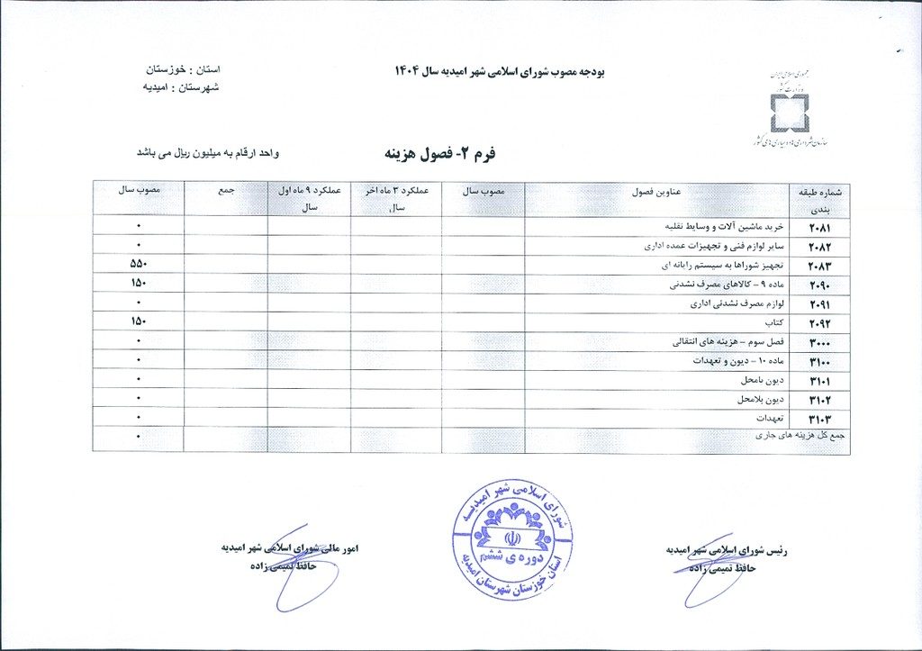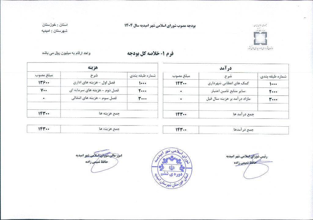 با عنایت به بند ج از فصل سوم بخشنامه بودجه سال ۱۴۰۴ و تخصیص مبلغ چهارده میلیارد و سیصد میلیون ریال به عنوان بودجه سال ۱۴۰۴ شورای اسلامی شهر، موضوع در جلسه مطرح و پس از بحث و بررسی با مجموع آراء ذيل مصوب گرديد.