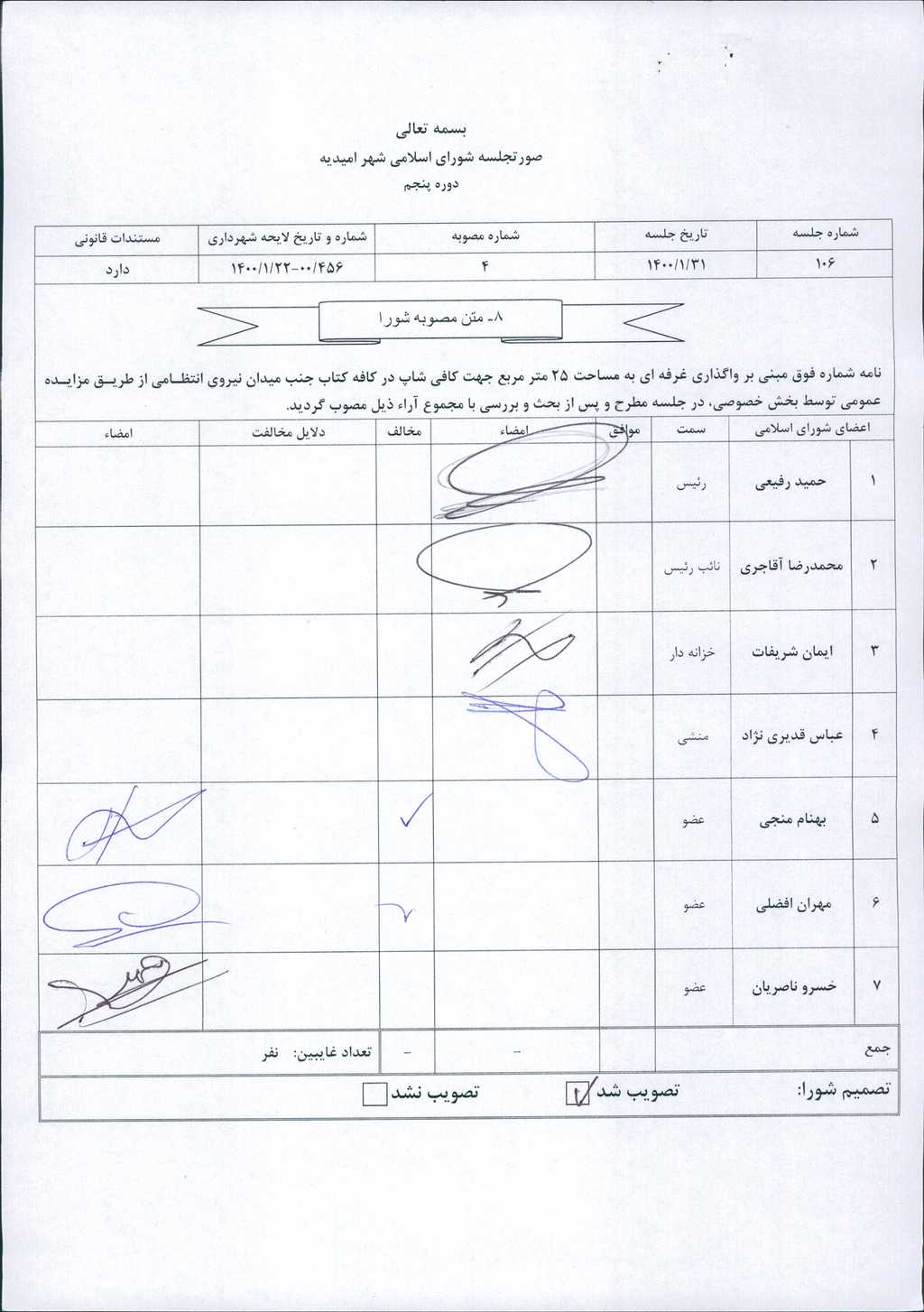 مصوبه شماره ۴ جلسه شماره ۱۰۶ شورای اسلامی شهر امیدیه