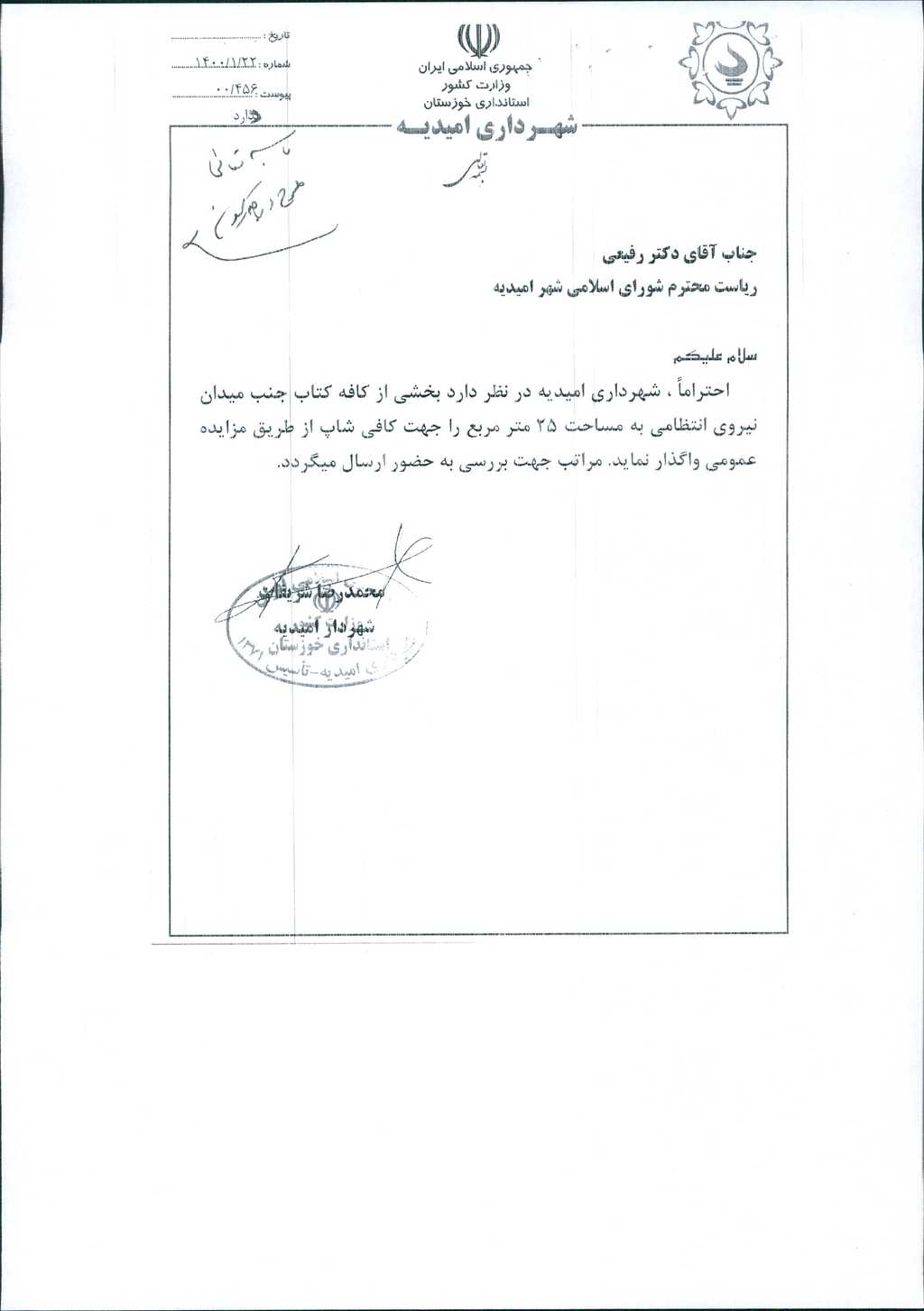 نامه شماره فوق مبنی بر واگذاری غرفه ای به مساحت ۲۵ متر مربع جهت کافی شاپ در کافه کتاب جنب میدان نیروی انتظامی از طریق مزایده عمومی توسط بخش خصوصی، در جلسه مطرح و پس از بحث و بررسی با مجموع آراء ذیل مصوب گردید.