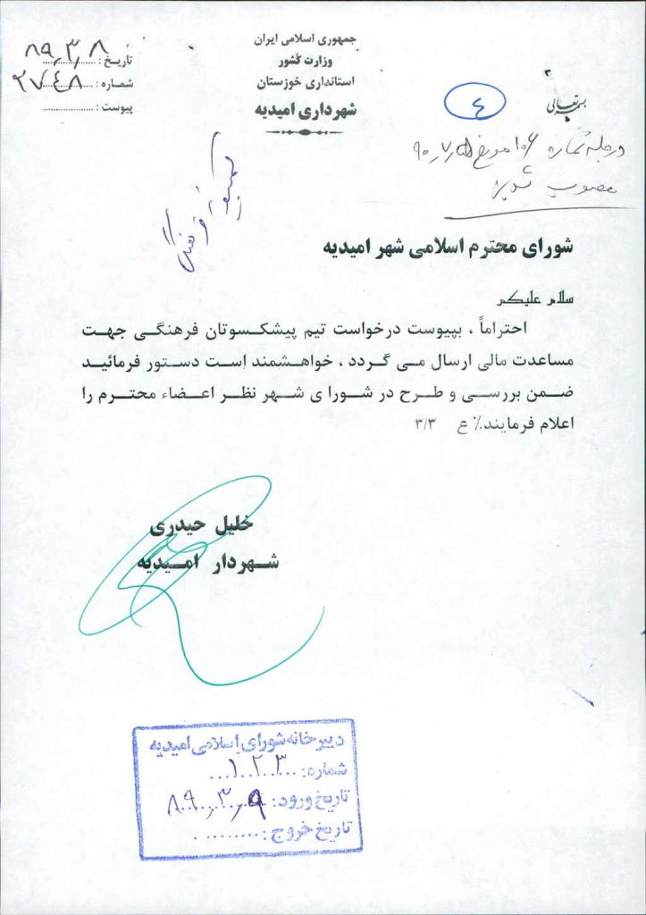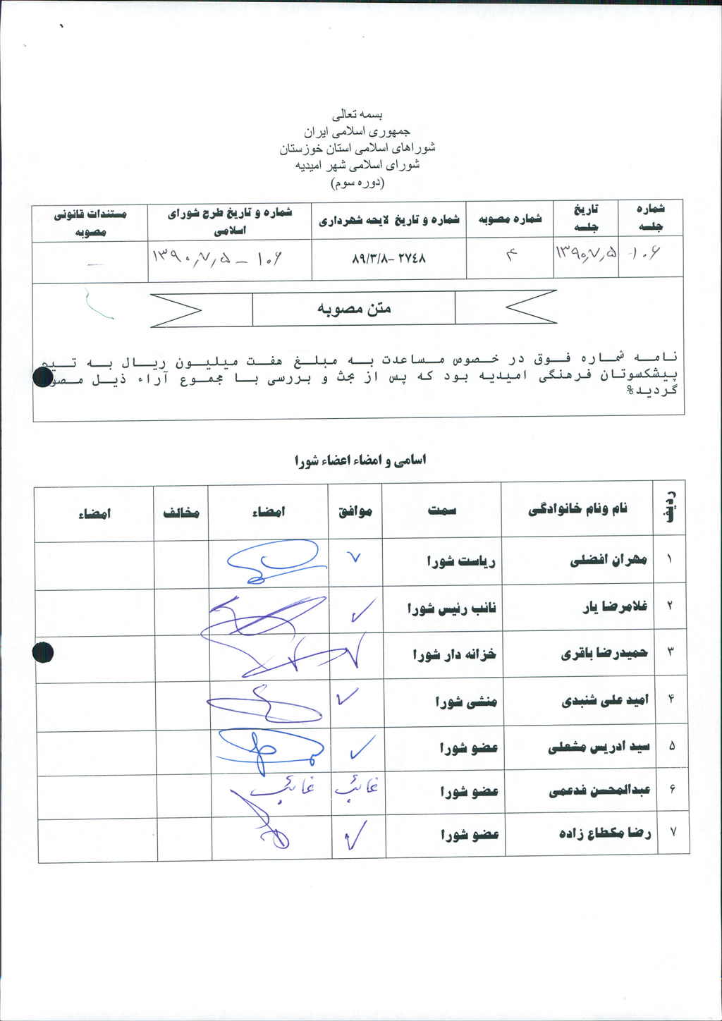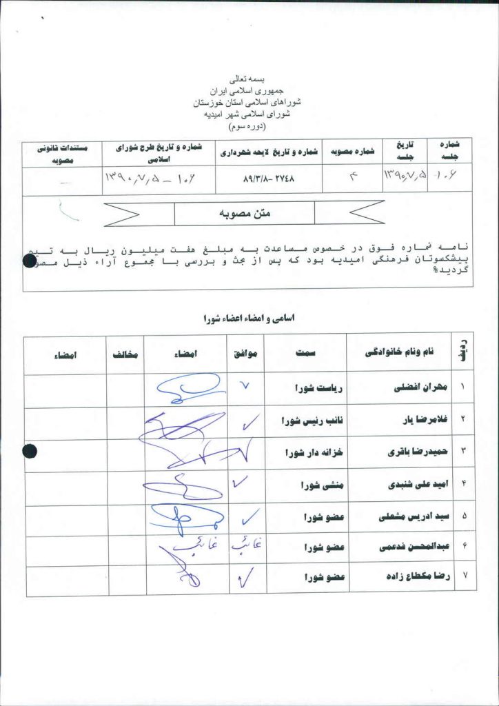 نامه شماره فوق در خصوص مساعدت به مبلغ هفت میلیون ریال(-/۰۰۰/۰۰۰/ ۷)ریال به تیم پیشکسوتان فرهنگی امیدیه بود که پس از بحث و بررسی با مجموع آراء ذیل مصوب گردید.