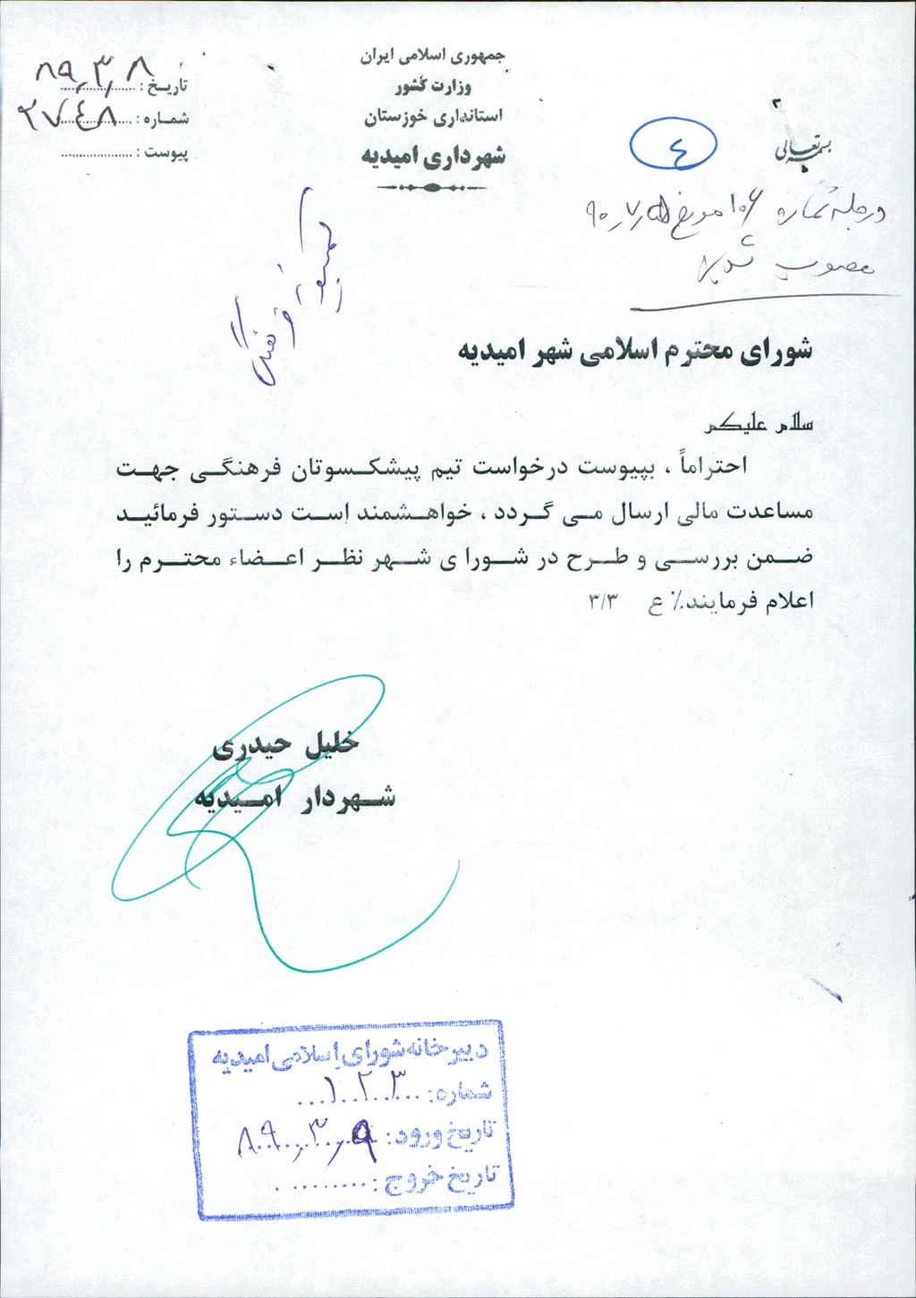 مصوبه شماره ۴ جلسه شماره ۱۰۶ مورخ ۹۰/۷/۵ شورای اسلامی شهر امیدیه