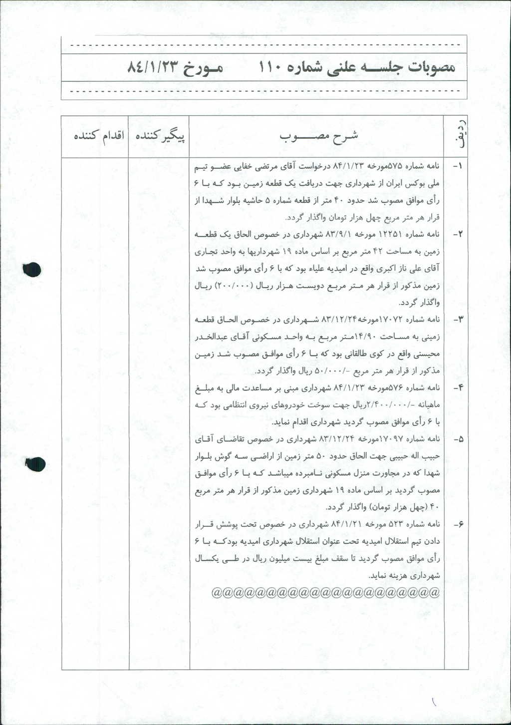 ۴-نامه شماره ۵۷۶مورخه ۲۳/ ۱/ ۸۴ شهرداري مبني بر مساعدت مالي به مبلغ ماهيانه-/۰۰۰/ ۴۰۰/ ۲ريال جهت سوخت خودروهاي نيروي انتظامي بود كه با ۶ رأي موافق مصوب گرديد شهرداري اقدام نمايد.