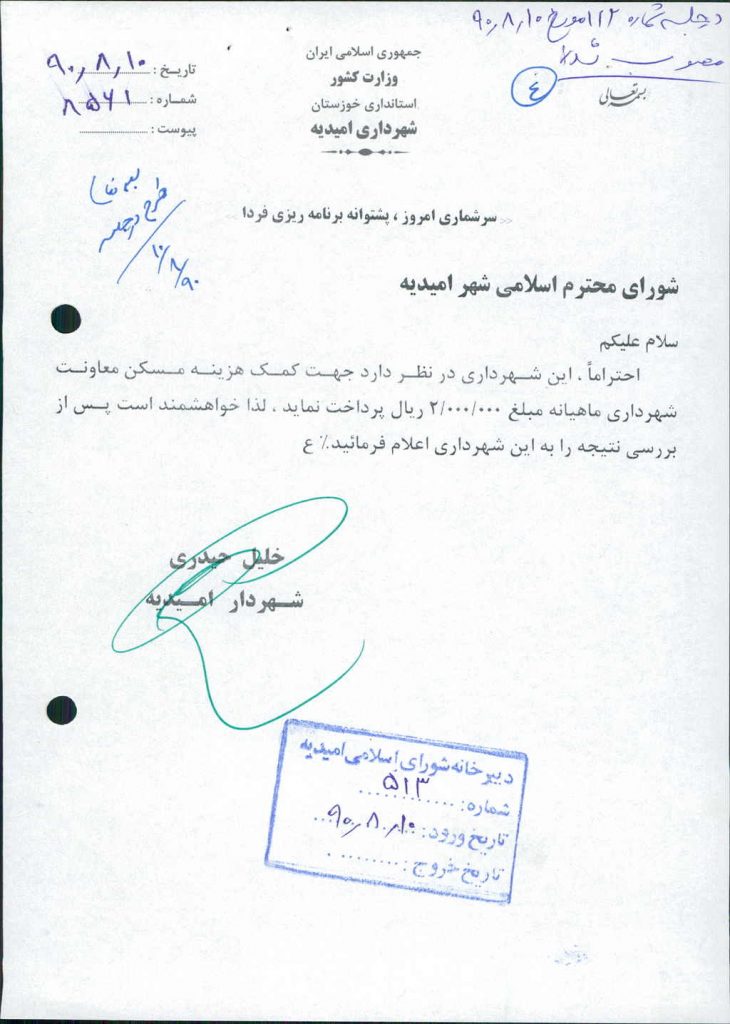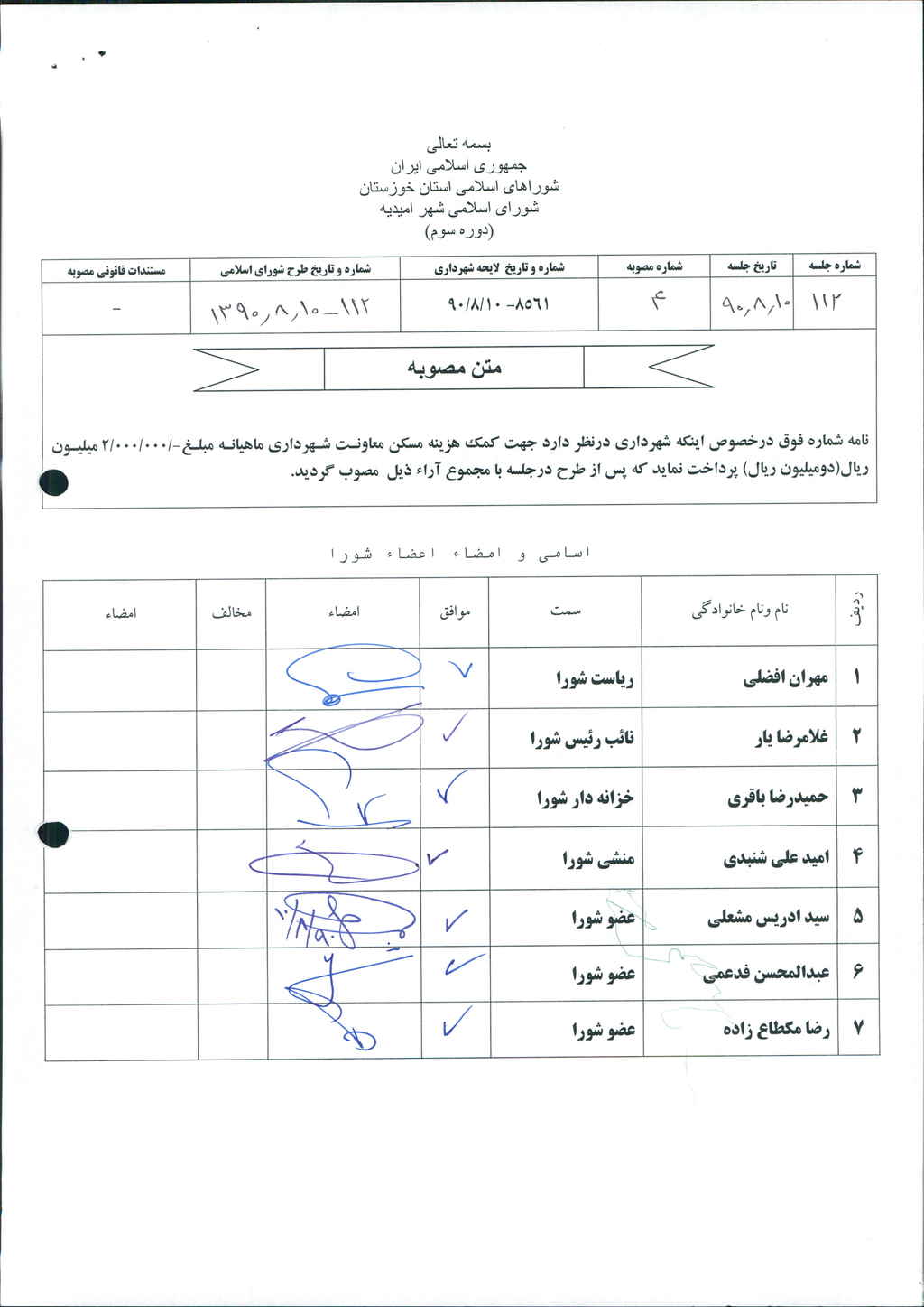 مصوبه شماره ۴ جلسه شماره ۱۱۲ شورای اسلامی شهر امیدیه