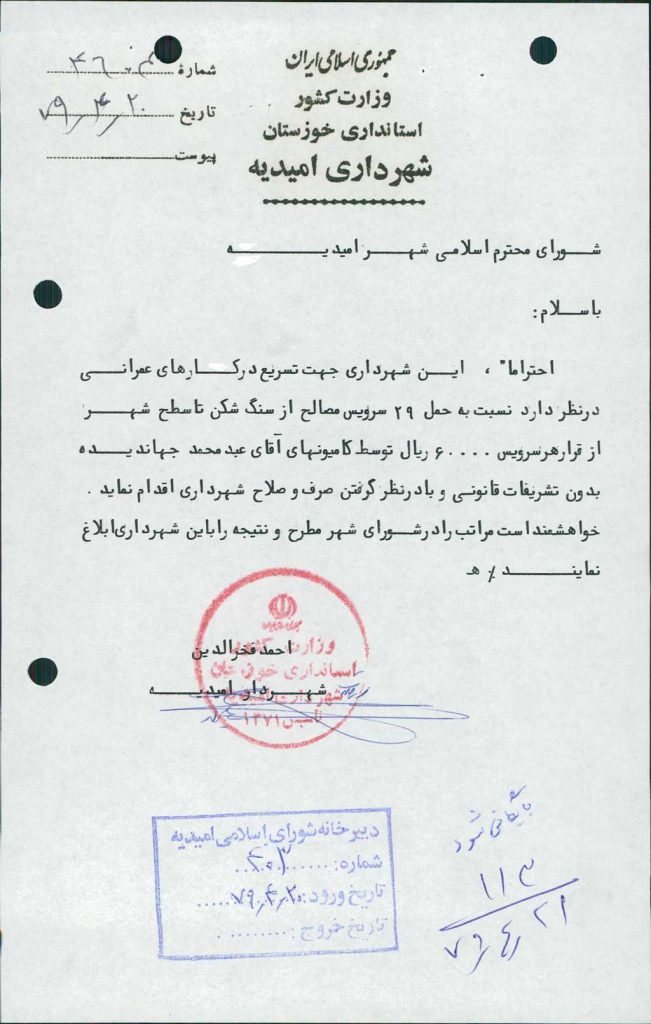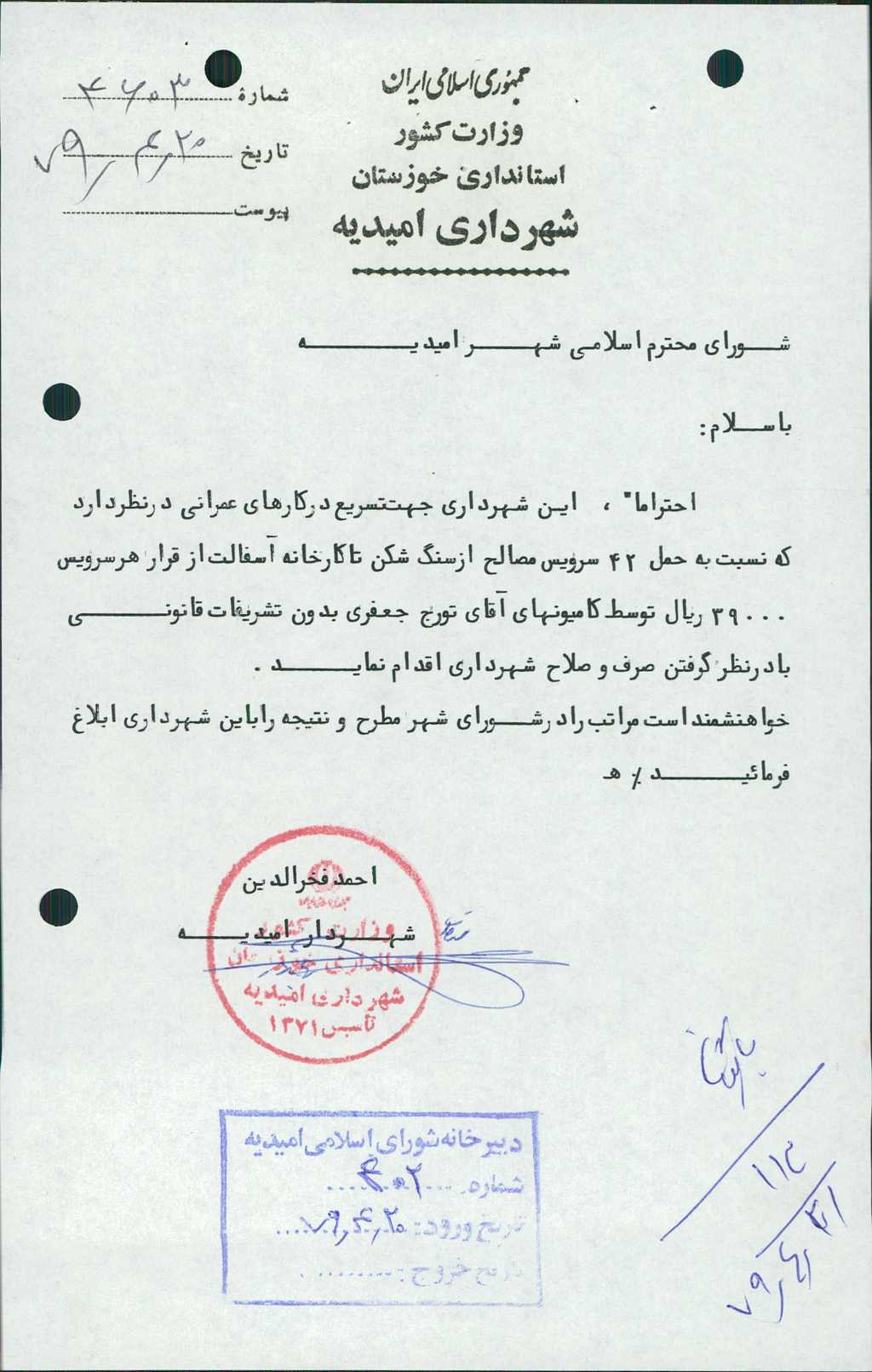 ۴-نامه شماره ۴۶۰۴و۴۶۰۳مورخ ۲۰ /۴/ ۷۹ شهرداري قرائت شد مقرر گرديد كه شهرداري در صورت نياز با انجام تشريفات قانوني نسبت به حمل مصالح اقدام كند ، با شش رأي مخالفت با نامه مذكور شد.