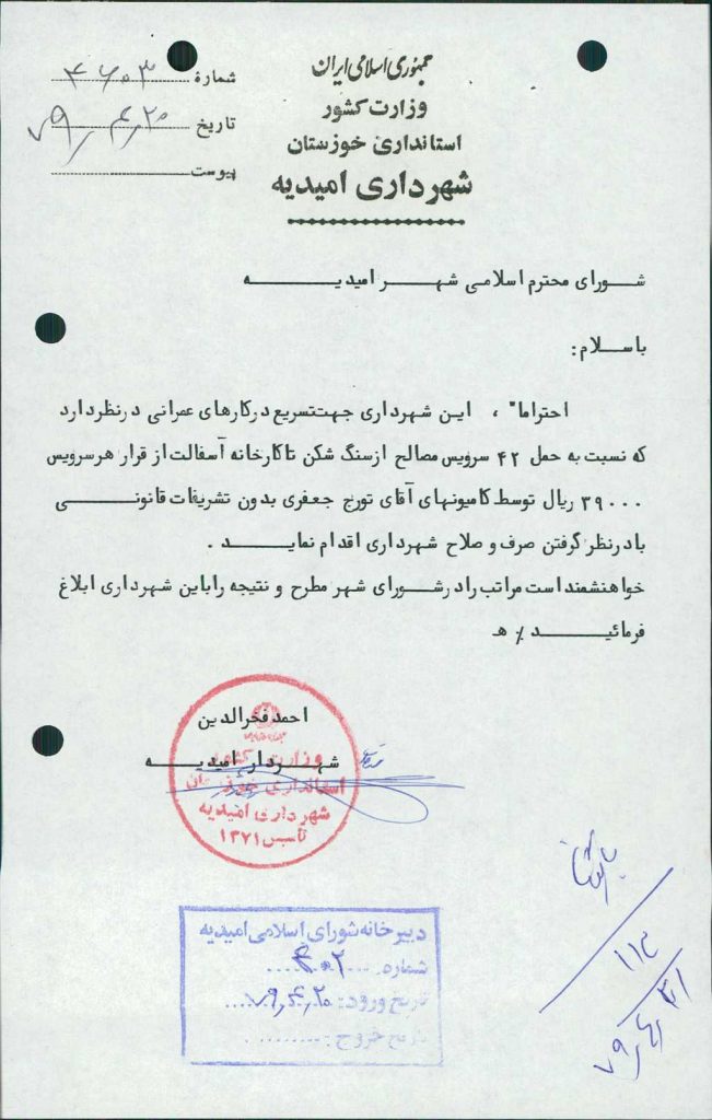 مصوبه شماره ۴ جلسه شماره ۱۱۳ شورای اسلامی شهر امیدیه
