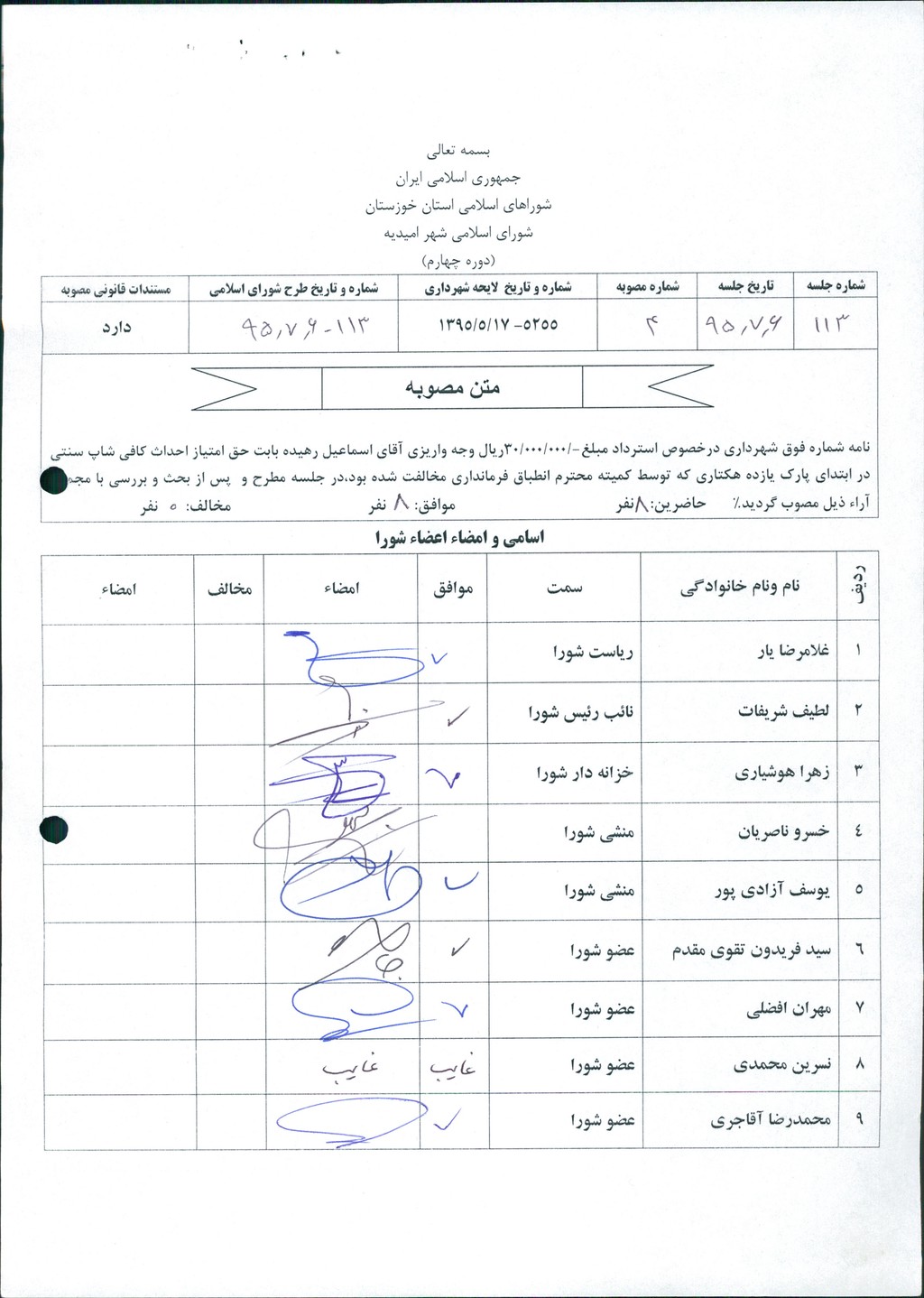 مصوبه شماره ۴ جلسه شماره ۱۱۳ شورای اسلامی شهر امیدیه