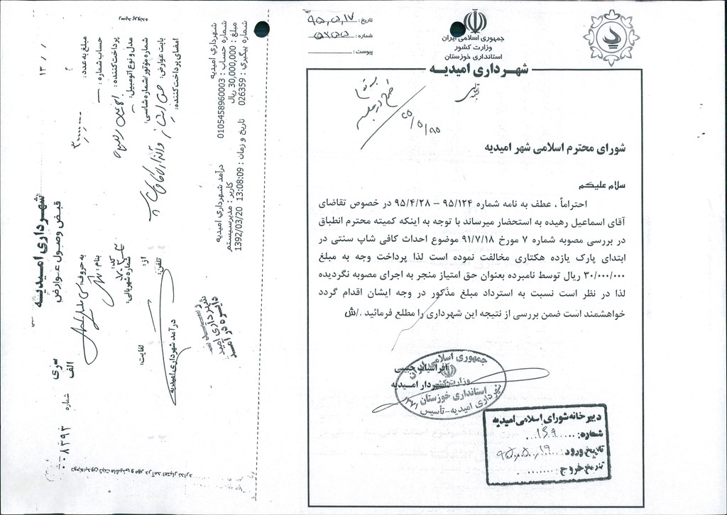 نامه شماره فوق شهرداری درخصوص استرداد مبلغ ۳۰۰۰۰۰۰۰ ريال وجه واریزی آقای اسماعیل رهیده بابت حق امتیاز احداث کافی شاپ سنتی در ابتدای پارک یازده هکتاری که توسط کمیته محترم انطباق فرمانداری مخالفت شده بود،در جلسه مطرح و پس از بحث و بررسی با مجموع آراء ذیل مصوب گردید%