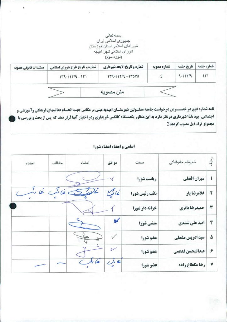 مصوبه شماره ۴ جلسه شماره ۱۲۱ شورای اسلامی شهر امیدیه