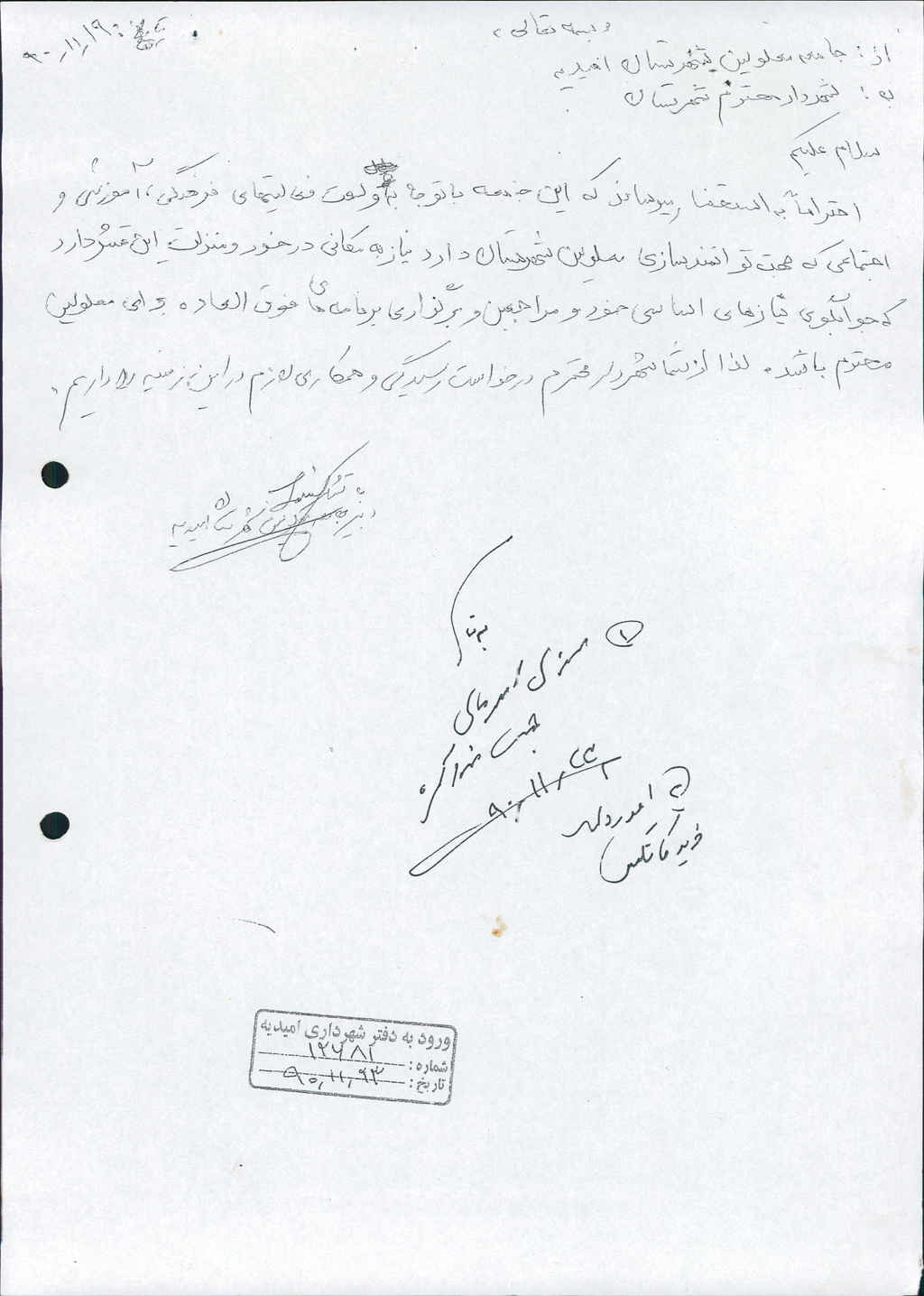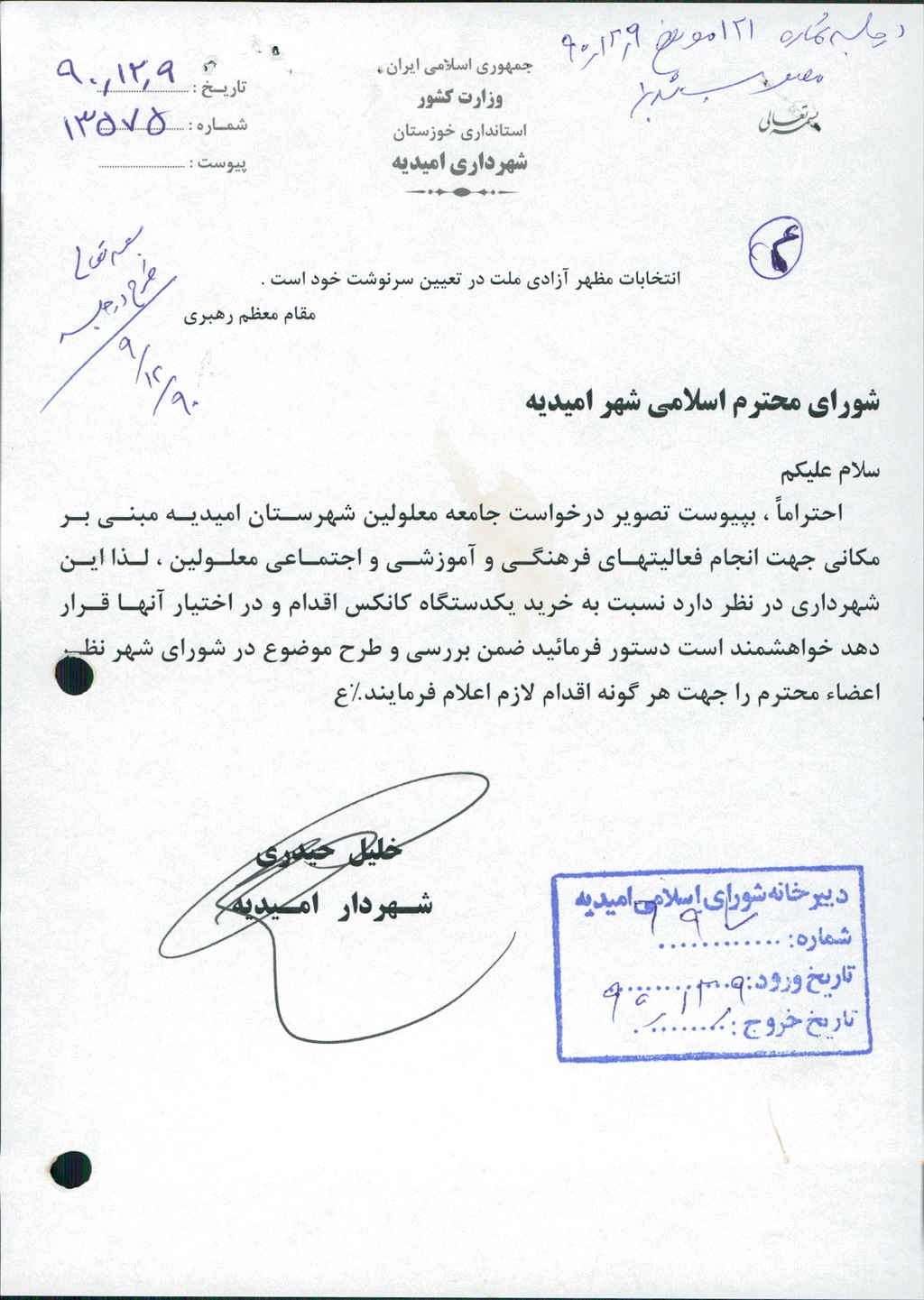 نامه شمـاره فوق در خصــوص درخواست جامعه معلـولین شهرستـان امیـدیه مبنی بر مکـانی جهت انجـام فعالیتهای فرهنگی وآمــوزشی و اجتماعی بود ،لذا شهرداری درنظر دارد به این منظور یکدستگاه کانکس خریداری ودر اختیار آنها قرار دهد که پس از بحث و بررسی با مجموع آراء ذیل مصوب گردید%