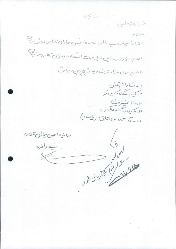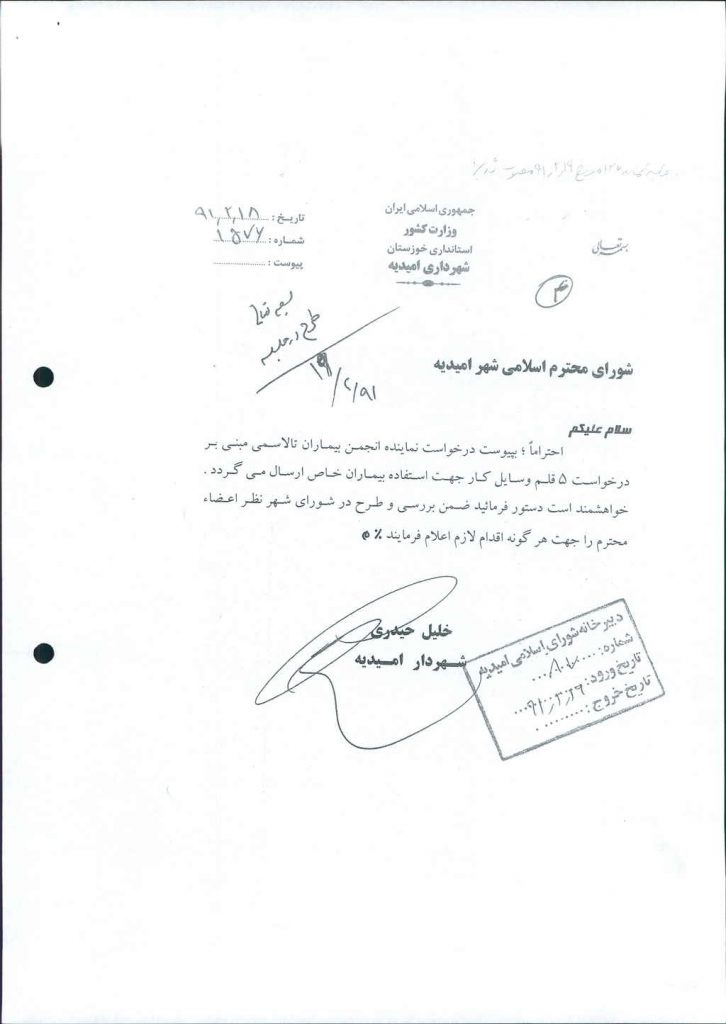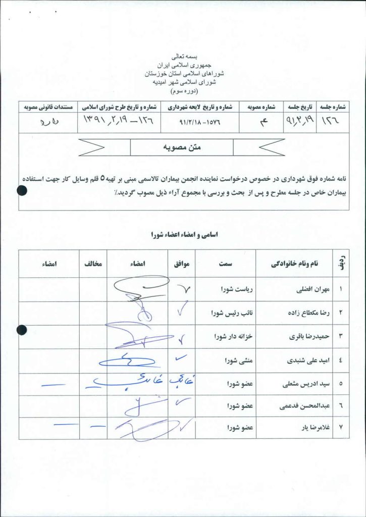 نامه شماره فوق شهرداری در خصوص درخواست نماینده انجمن بیماران تالاسمی مبنی بر تهیه۵ قلم وسایل کار جهت استفاده بیماران خاص در جلسه مطرح و پس از بحث و بررسی با مجموع آراء ذیل مصوب گردید.