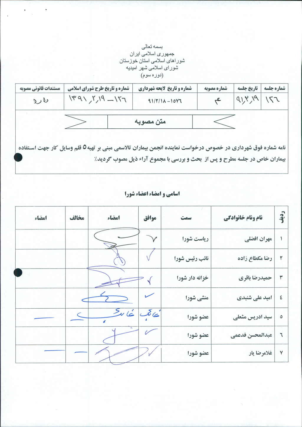مصوبه شماره ۴ جلسه شماره ۱۲۶ شورای اسلامی شهر امیدیه
