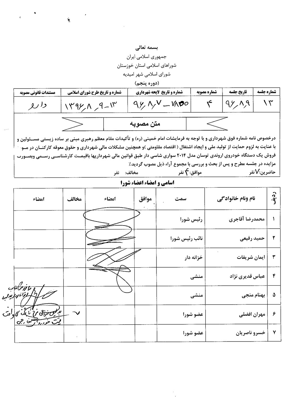 مصوبه شماره ۴ جلسه شماره ۱۳ مورخ ۹۶/۸/۹ شورای اسلامی شهر امیدیه