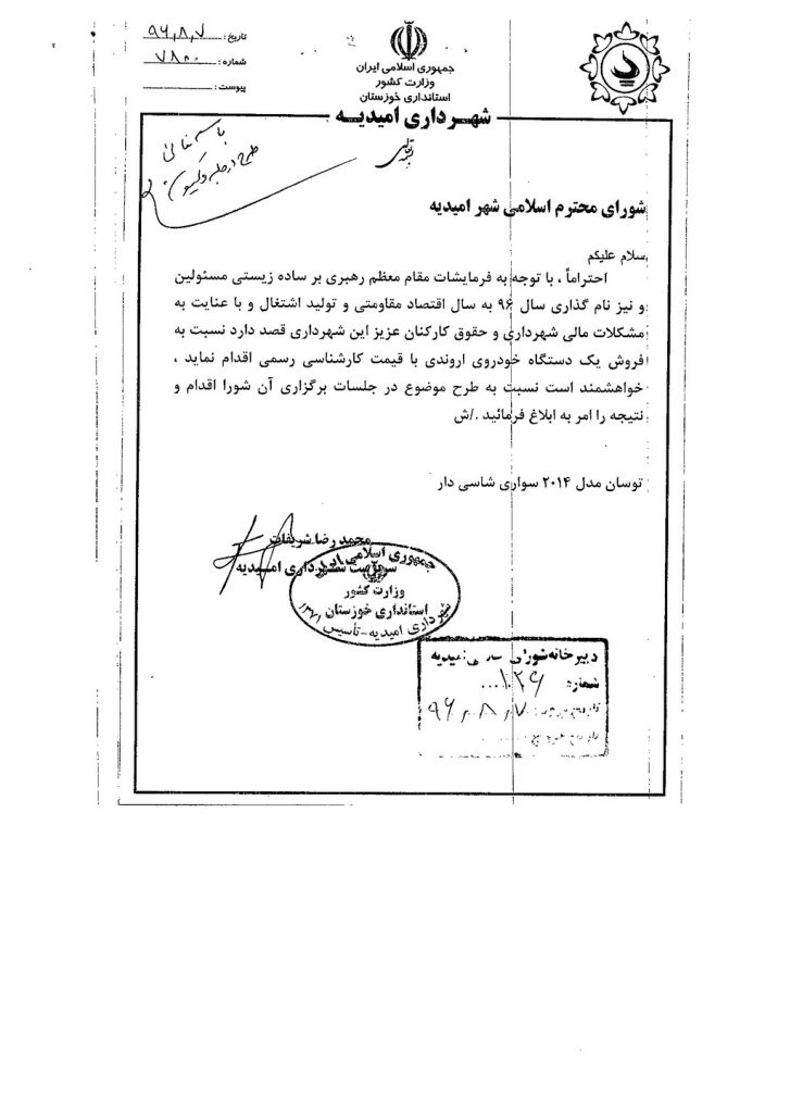 درخصوص نامه شماره فوق شهرداری و با توجه به فرمایشات امام خمینی (ره) و تأکیدات مقام معظم رهبری مبنی بر ساده زیستی مسئولین و با عنایت به لزوم حمایت از تولید ملی و ایجاد اشتغال ( اقتصاد مقاومتی )و همچنین مشکلات مالی شهرداری و حقوق معوقه کارکنان در مورد فروش یک دستگاه خودروی اروندی توسان مدل ۲۰۱۴ سواری شاسی دار طبق قوانین مالی شهرداریها باقیمت کارشناسی رسمی وبصورت مزایده در جلسه مطرح و پس از بحث و بررسی با مجموع آراء ذیل مصوب گردید%