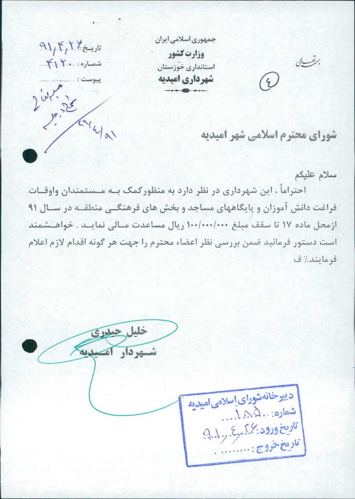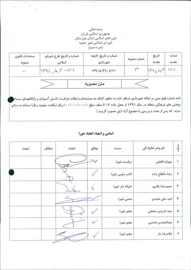 مصوبه شماره ۴ جلسه شماره ۱۳۲ شورای اسلامی شهر امیدیه