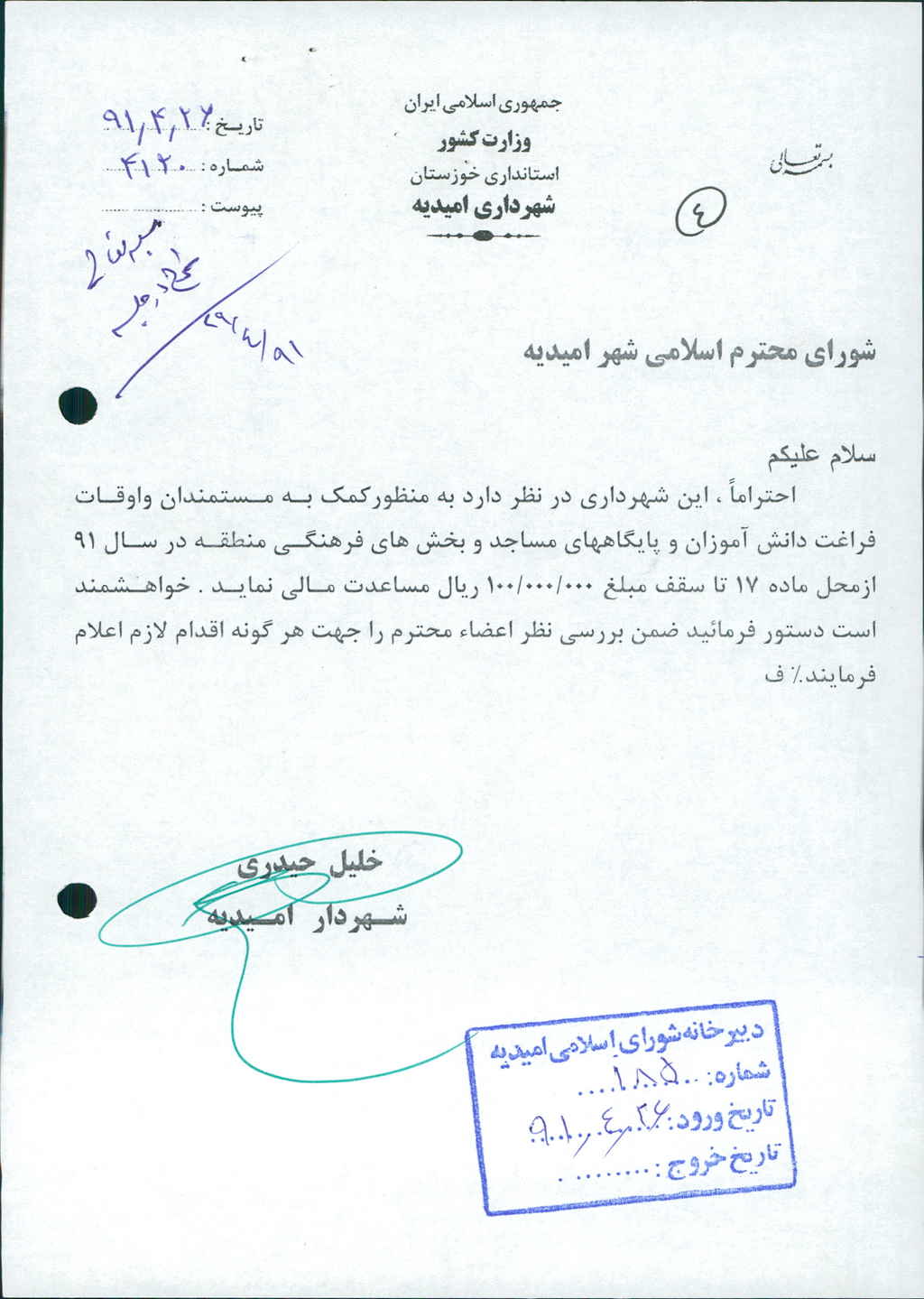 نامه شماره فوق مبنی بر اینکه شهرداری درنظر دارد به منظور کمک به مستمندان و اوقات فراغت دانش آموزان و پایگاههای مساجد وبخش های فرهنگی منطقه در سال ۱۳۹۱ از محل ماده ۱۷ تا سقف مبلغ -/۰۰۰/۰۰۰/ ۱۰۰ریال (یکصد میلیون ریال) مساعدت مالی نماید ،که پس از بحث و بررسی با مجموع آراء ذیل مصوب گردید%