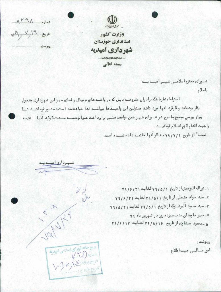 مصوبه شماره ۴ جلسه شماره ۱۳۹ مورخ ۷۹/۷/۲۶ شورای اسلامی شهر امیدیه