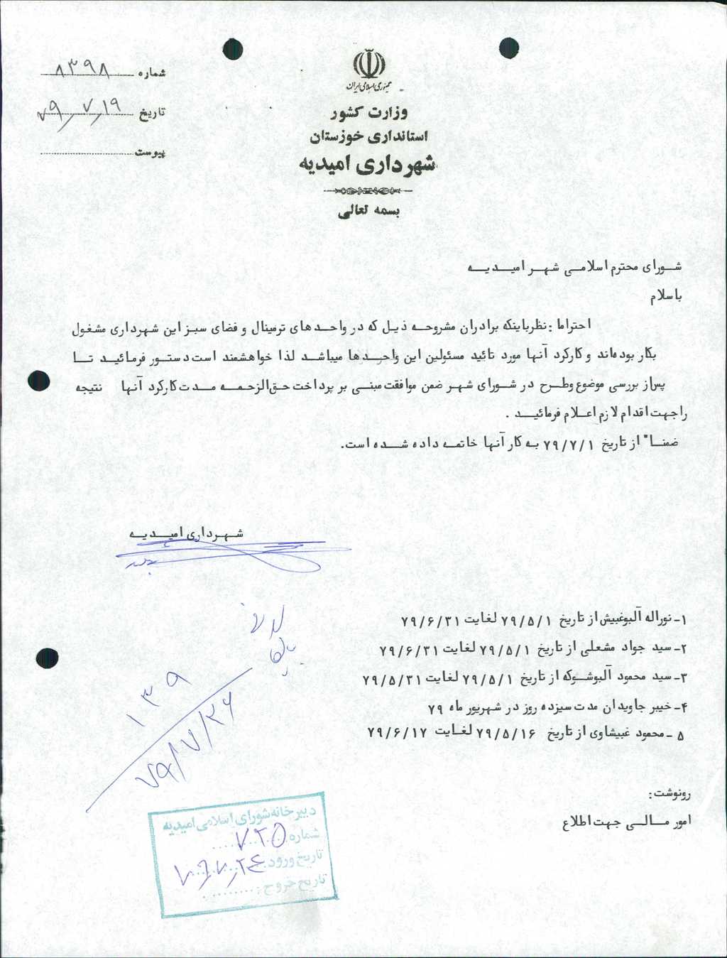 ۴-نامه شماره ۸۳۹۸ مورخه ۱۹/ ۷/ ۷۹ شهرداري در خصوص پرداخت حق الزحمه مدت كاركرد تعداد ۵ نفر از كارگران فضاي سبز و ترمينال شهري مطرح و با ۵رأي موافق به تصويب رسيد.
