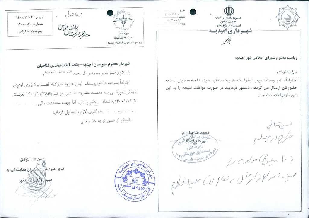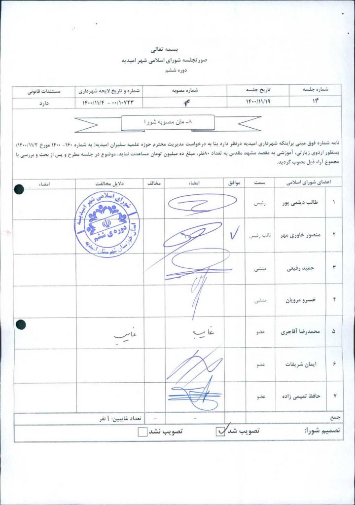 نامه شماره فوق مبنی براینکه شهرداری امیدیه درنظر دارد بنا به درخواست مدیریت محترم حوزه علمیه سفیران امیدیه( به شماره ۱۶۰ – ۱۴۰۰ مورخ ۲/ ۱۱/ ۱۴۰۰) بمنظور اردوی زیارتی، آموزشی به مقصد مشهد مقدس به تعداد ۸۰نفر، مبلغ ده میلیون تومان مساعدت نماید، موضوع در جلسه مطرح و پس از بحث و بررسی با مجموع آراء ذیل مصوب گردید.