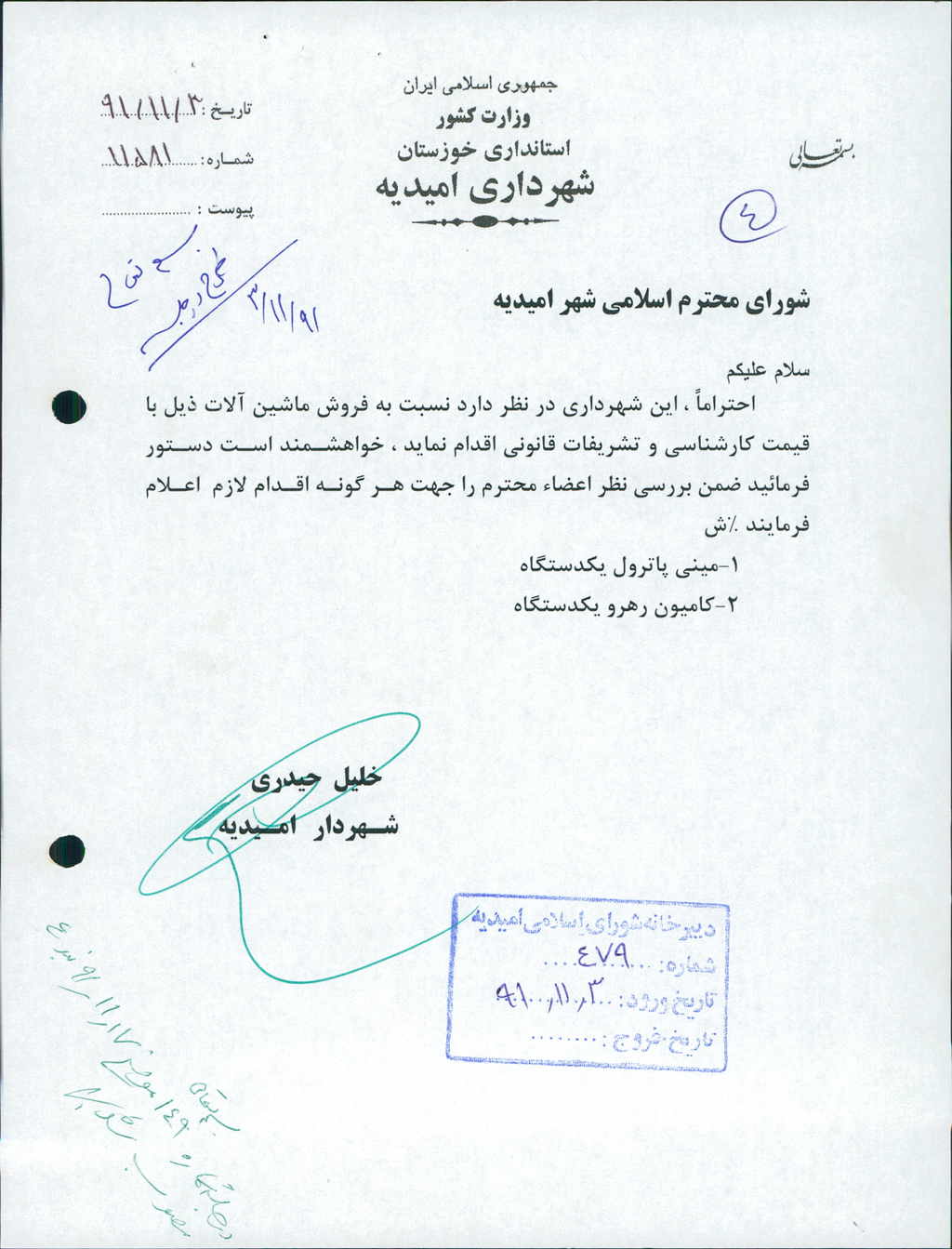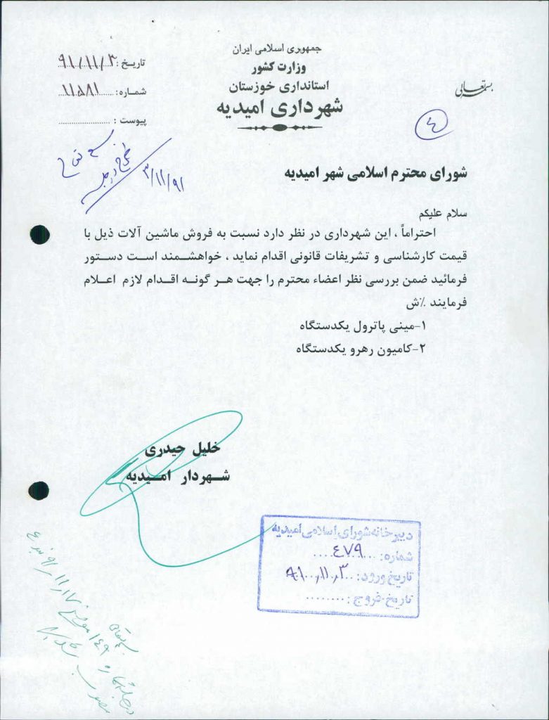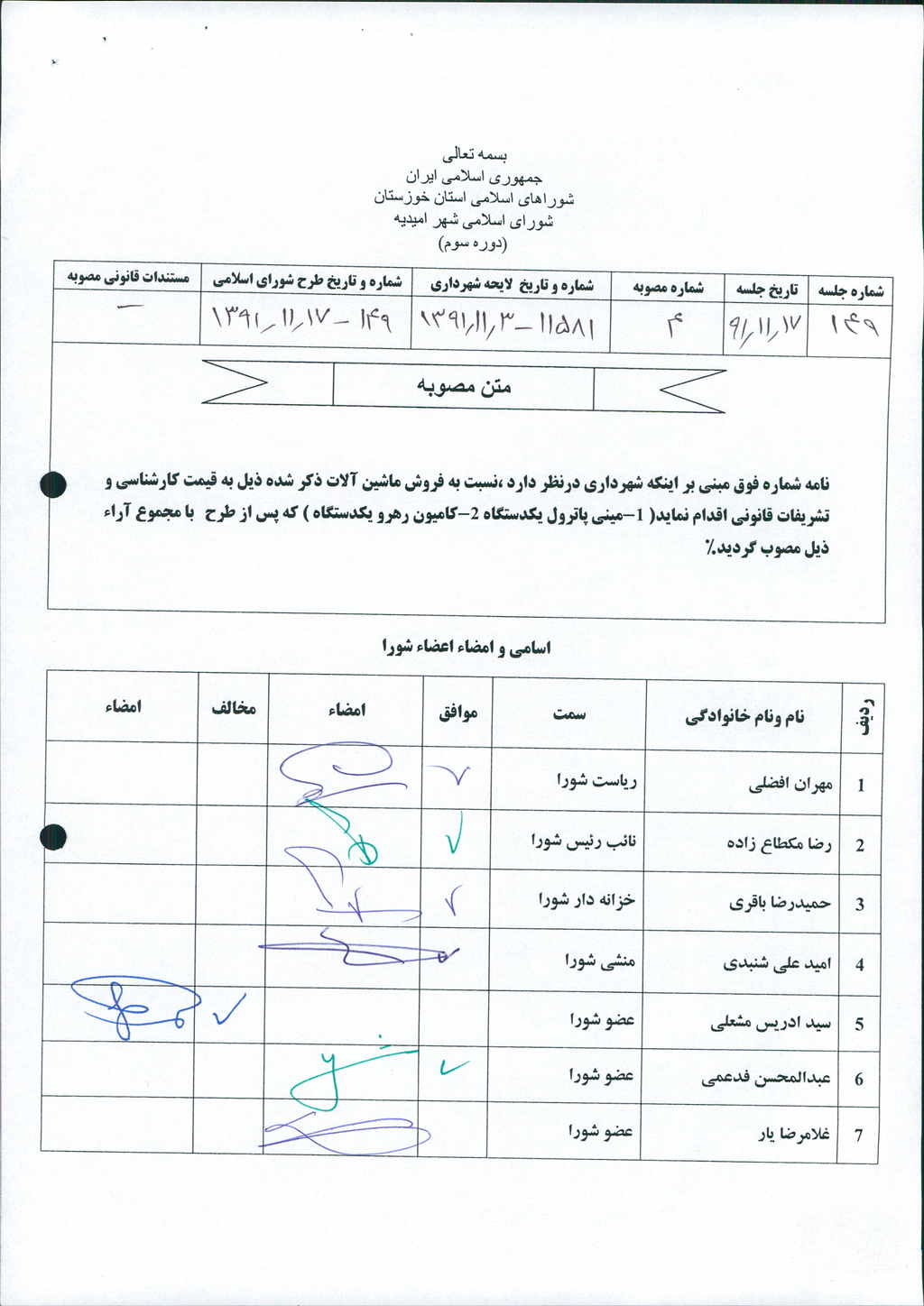مصوبه شماره ۴ جلسه شماره ۱۴۹ مورخ ۹۱/۱۱/۱۷ شورای اسلامی شهر امیدیه