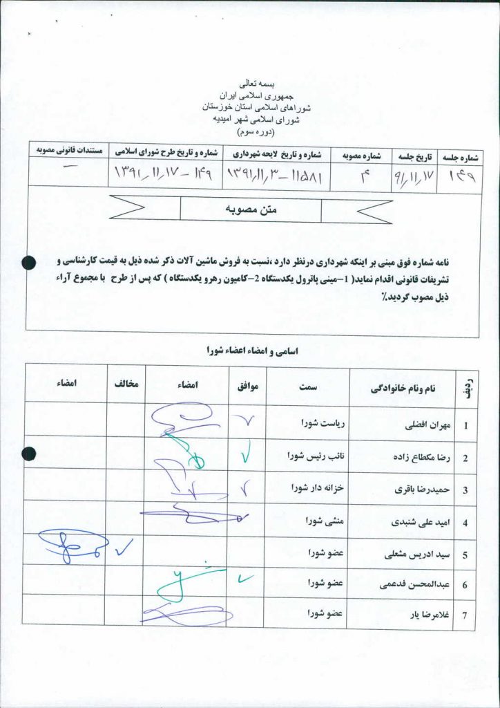 مصوبه شماره ۴ جلسه شماره ۱۴۹ شورای اسلامی شهر امیدیه