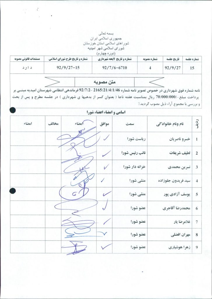 مصوبه شماره ۴ جلسه شماره ۱۵ شورای اسلامی شهر امیدیه