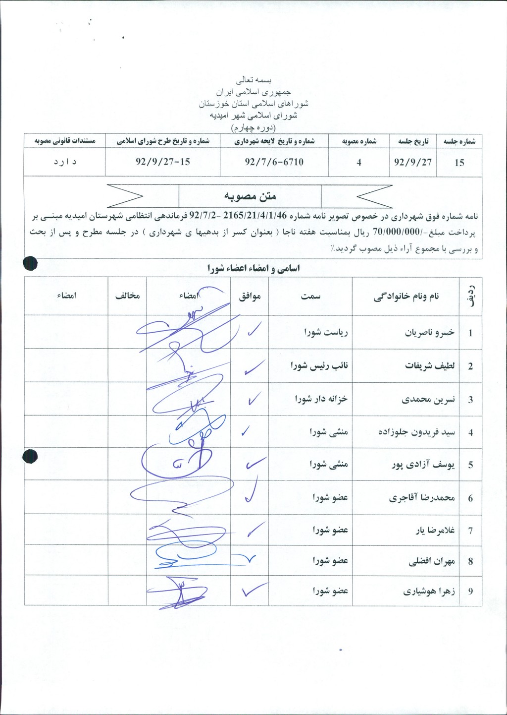 مصوبه شماره ۴ جلسه شماره ۱۵ مورخ ۹۲/۹/۲۷ شورای اسلامی شهر امیدیه