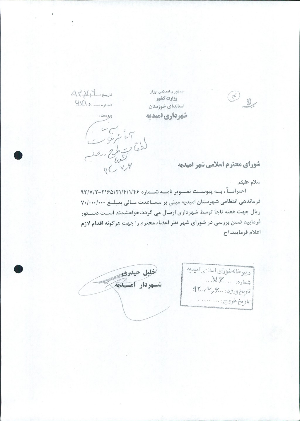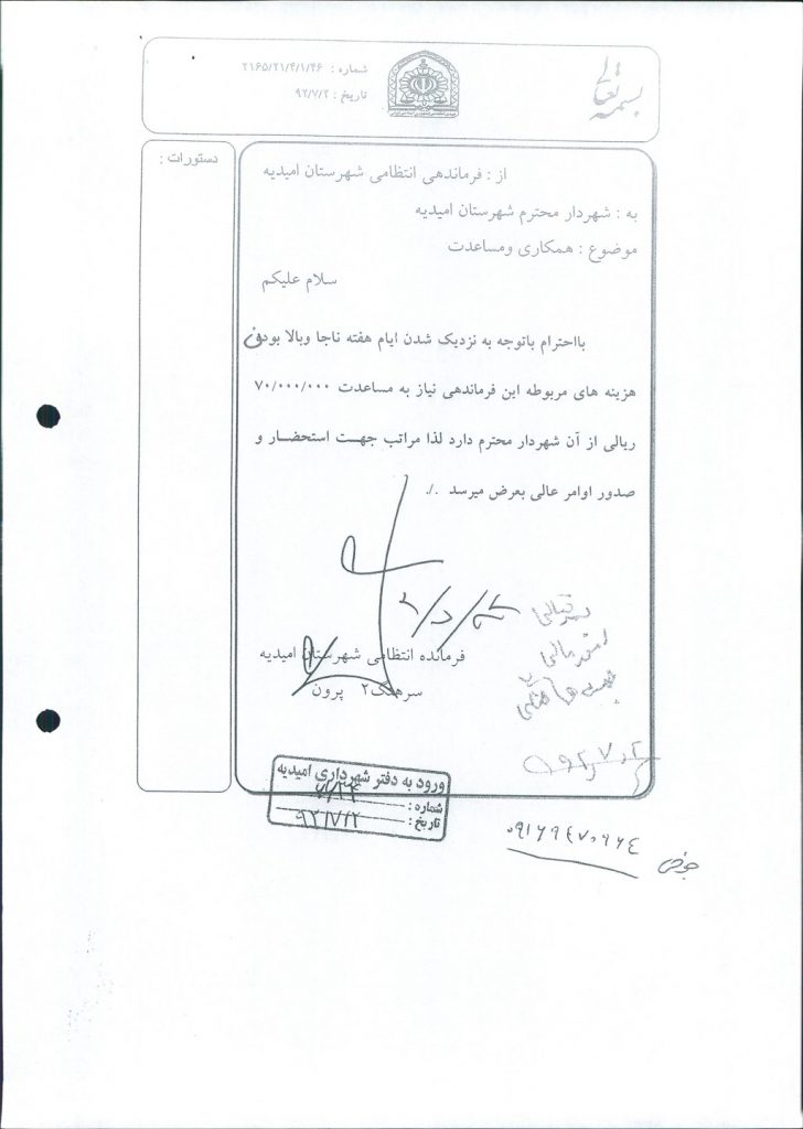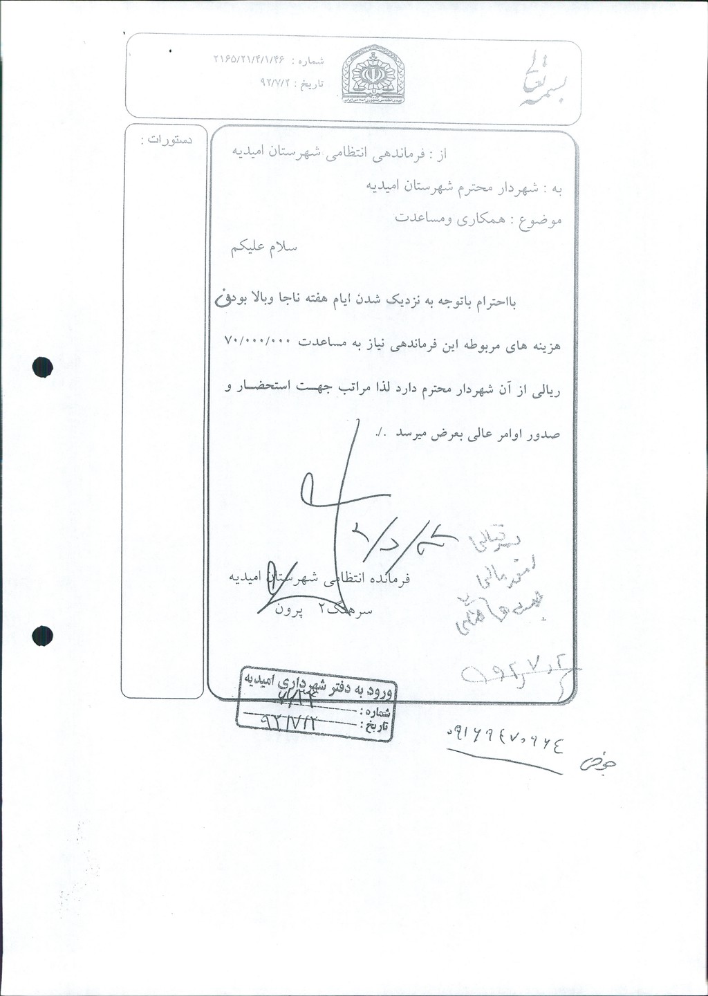 نامه شماره فوق شهرداری در خصوص تصویر نامه شماره ۴۶/۱/۴/۲۱/۲۱۶۵ -۲/۷/۹۲ فرماندهی انتظامی شهرستان امیدیه مبنـی بر  پرداخت مبلغ۷۰۰۰۰۰۰۰ریال بمناسبت هفته ناجا ( بعنوان کسر از بدهیها ی شهرداری ) در جلسه مطرح و پس از بحث و بررسی با مجموع آراء ذیل مصوب گردید%