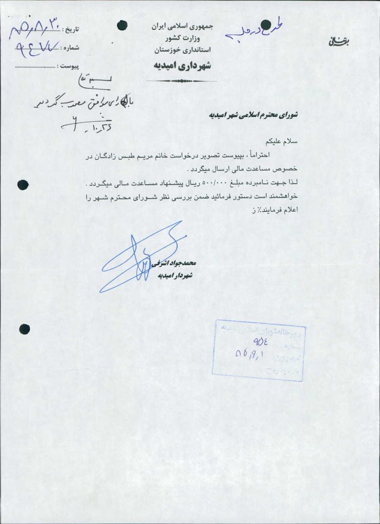 ۴-نامه شماره ۹۴۷۷-۳۰/ ۸/ ۸۵شهرداري مبني بر مساعدت به مبلغ -/۰۰۰/ ۵۰۰ريال (پانصد هزار ريال)به خانم مريم طبس زادگان بود كه با ۵رأي موافق مصوب گرديد.