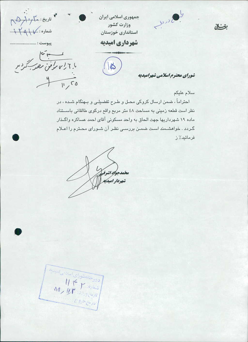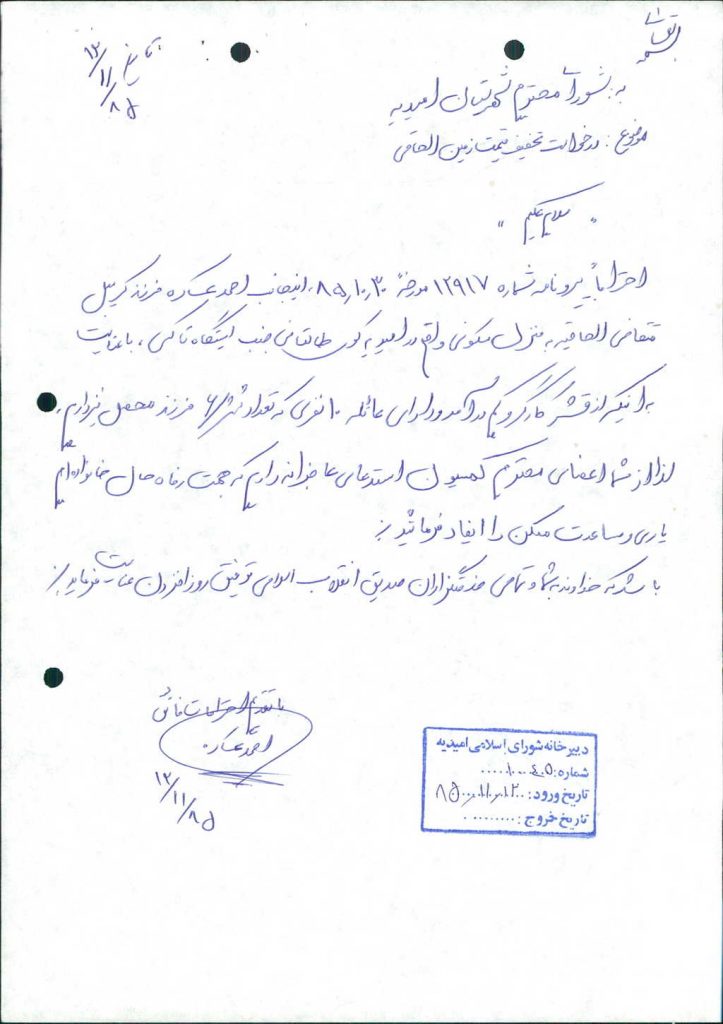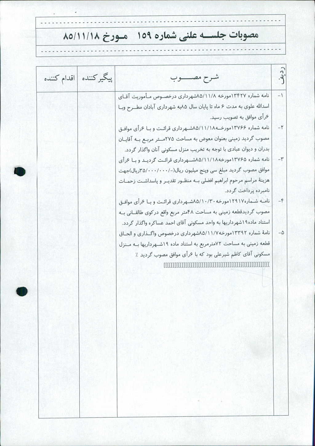 ۴-نامه شماره۱۲۹۱۷مورخه۳۰/ ۱۰/ ۸۵شهرداري قرائت و با ۶رأي موافق مصوب گرديدقطعه زميني به مساحت ۴۸متر مربع واقع دركوي طالقاني به استناد ماده۱۹شهرداريها به واحد مسكوني آقاي احمد عساكره واگذار گردد.