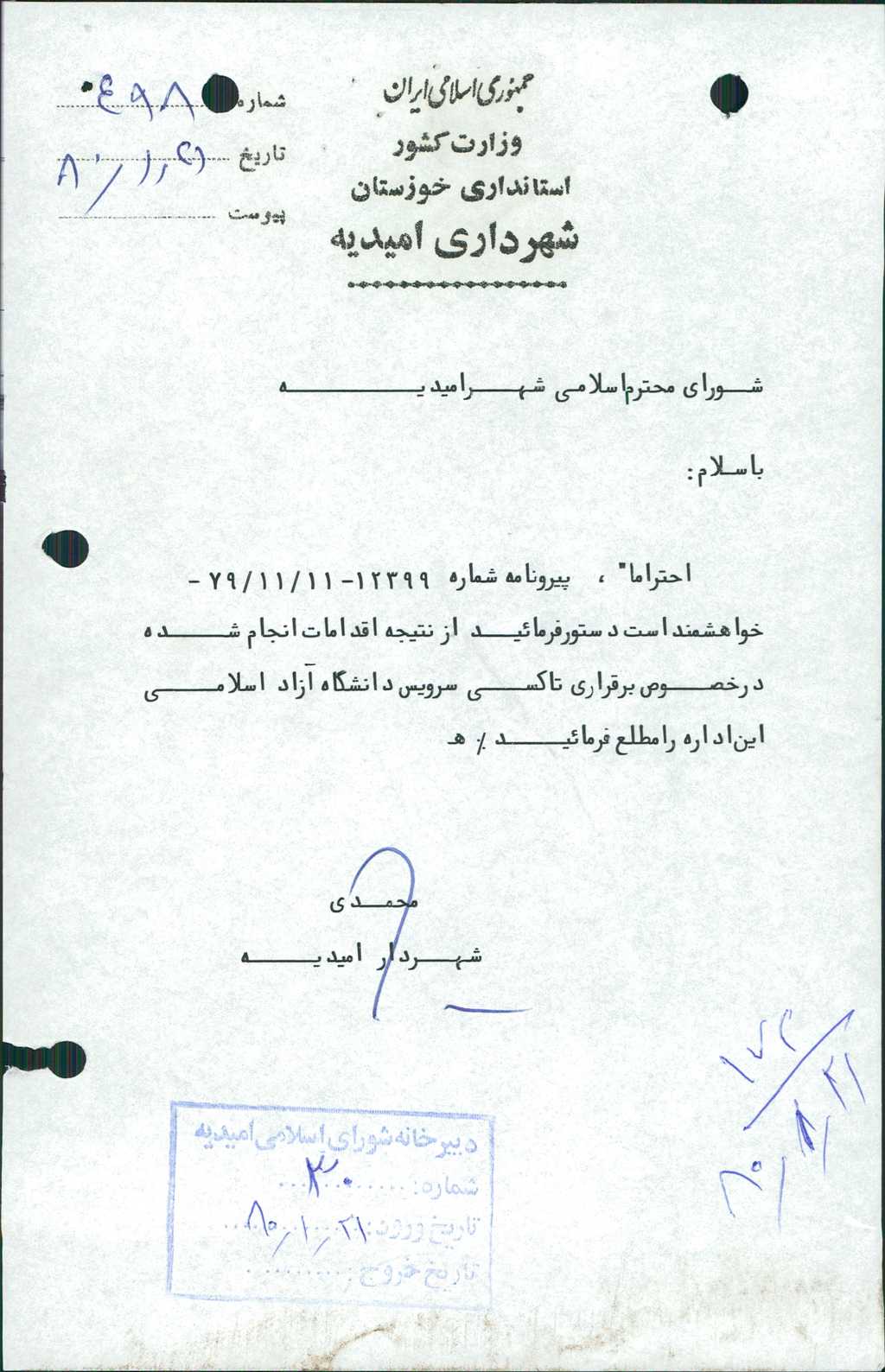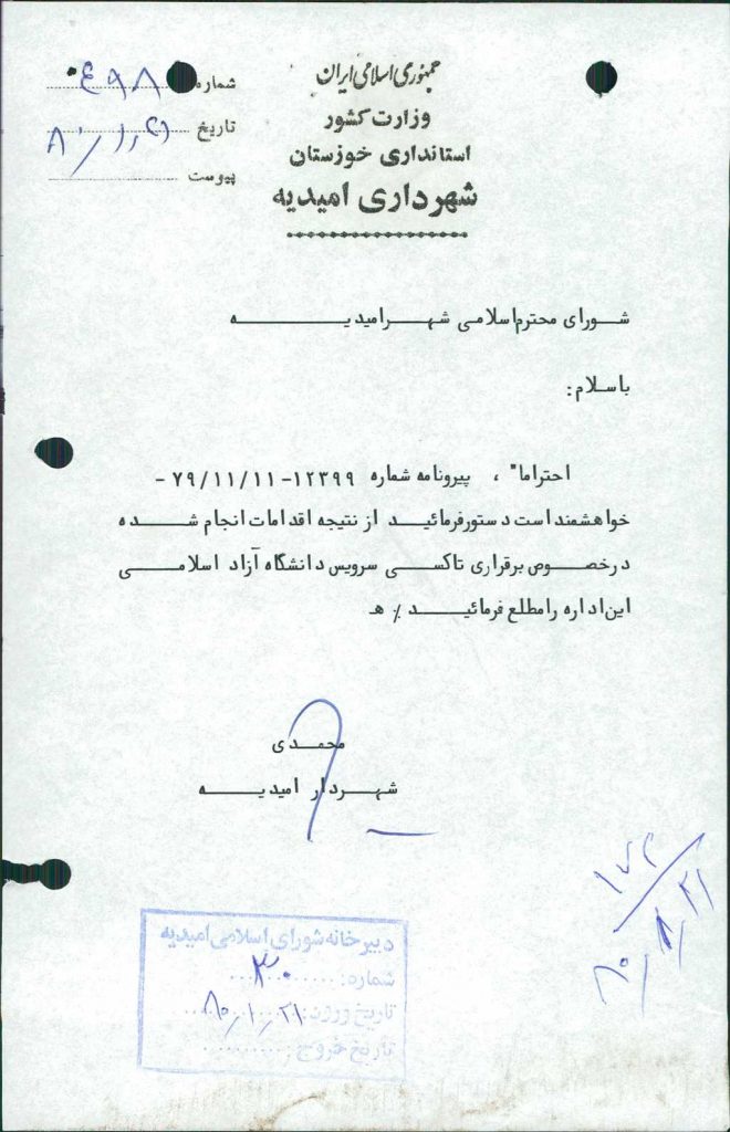 ۴-نامه شماره ۴۹۸-۲۱/ ۱/ ۸۰ شهرداری در خصوص تاکسی سرویس دانشگاه آزاد اسلامی مطرح و با تعداد ۶ رأی موافق مقرر گردید با توجه به نیاز و ضرورت و طی مراحل قانونی به صورت مزایده اقدام گردد.