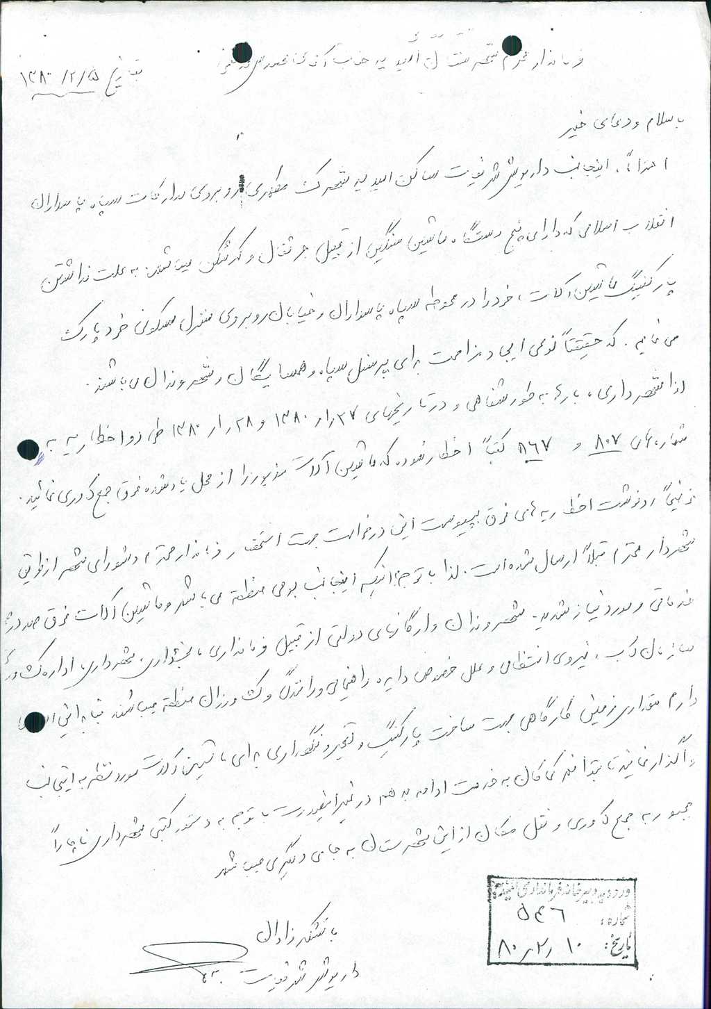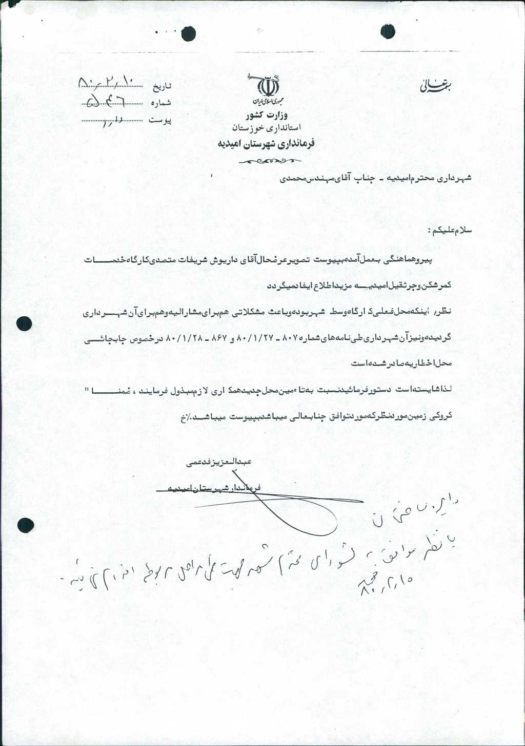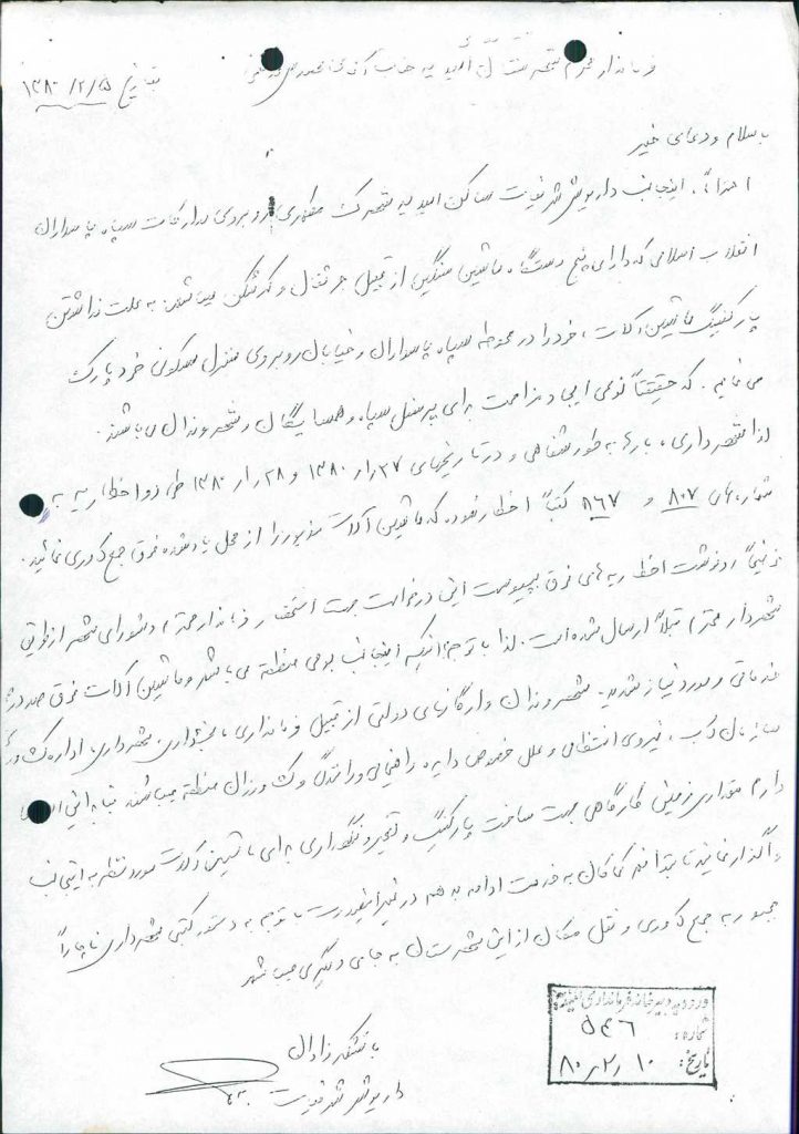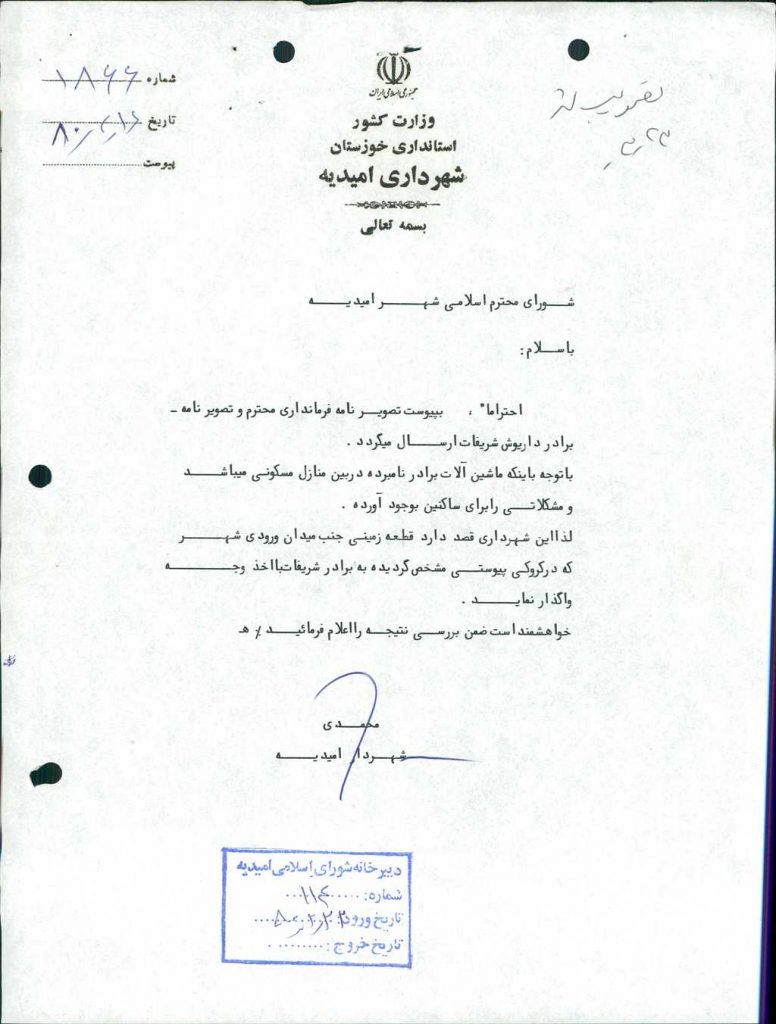 ۴-نامه شماره ۱۸۶۶-۱۶/ ۲/ ۸۰شهرداری مبنی بر واگذاری قطعه زمین جنب میدان ورودی شهر که در کروکی پیوستی با اخذ وجه مطرح گردید که با ۶ رأی به تصویب رسید(نامه مربوط به برادر داریوش شریفات       می باشد.