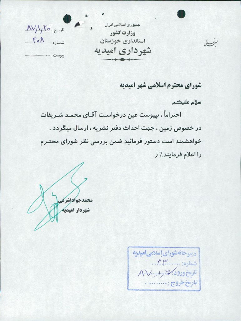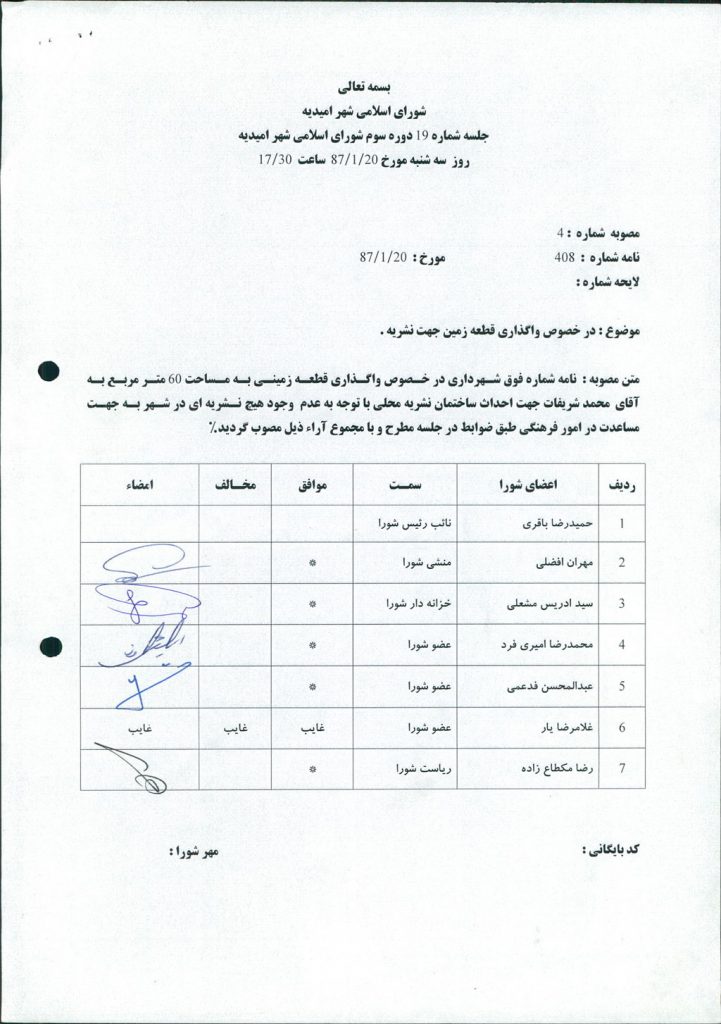 مصوبه شماره ۴ جلسه شماره ۱۹ شورای اسلامی شهر امیدیه