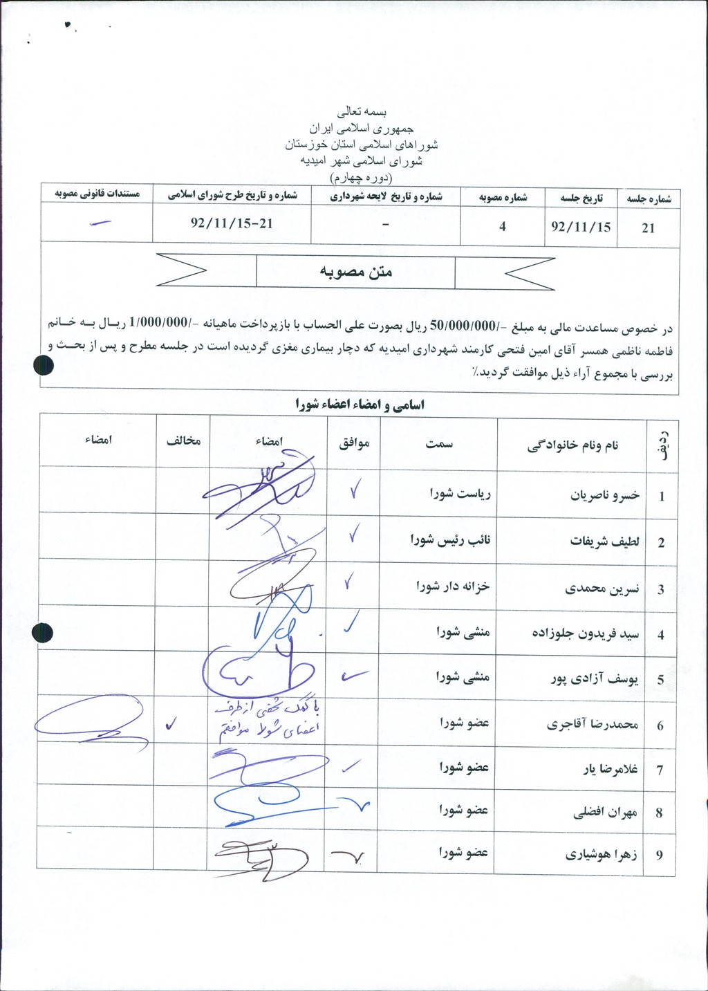 در خصوص مساعدت مالی به مبلغ ۵۰۰۰۰۰۰۰ریال بصورت علی الحساب با بازپرداخت ماهیانه ۱۰۰۰۰۰۰ ریال به خانم فاطمه ناظمی همسر آقای امین فتحی کارمند شهرداری امیدیه که دچار بیماری مغزی گردیده است در جلسه مطرح و پس از بحث و بررسی با مجموع آراء ذیل موافقت گردید%
