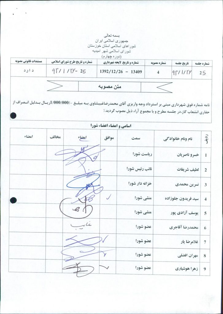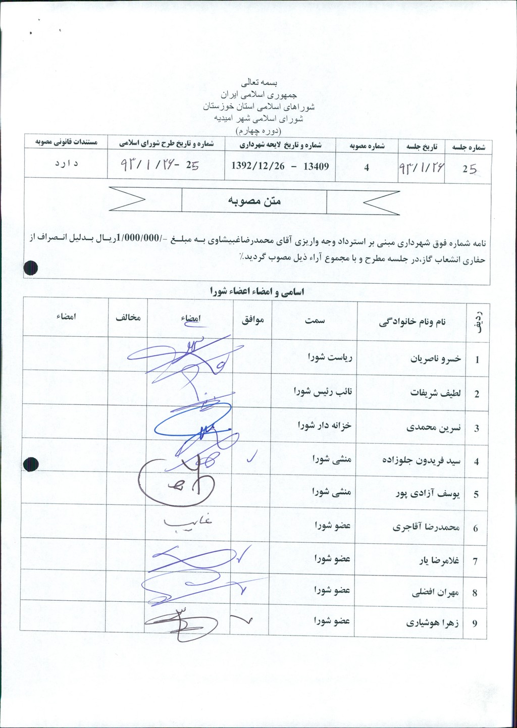 مصوبه شماره ۴ جلسه شماره ۲۵ مورخ ۹۳/۱/۲۶ شورای اسلامی شهر امیدیه