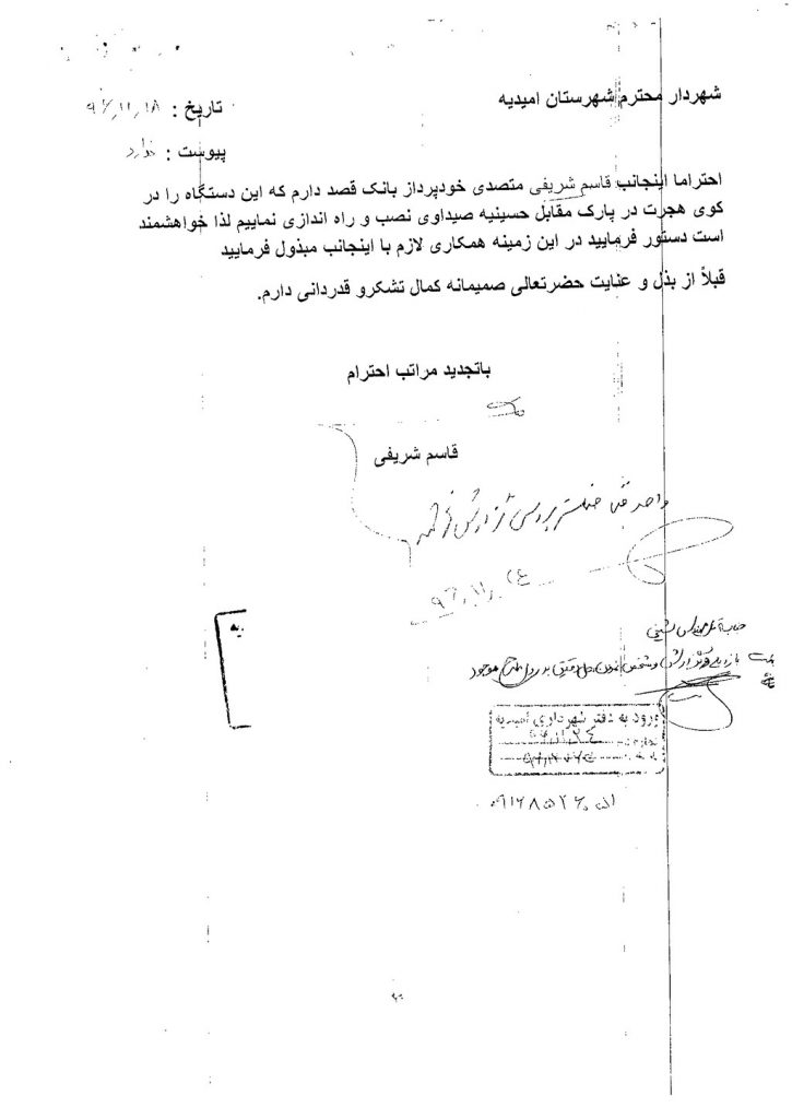 نامه شماره فوق شهرداری در خصوص اختصاص زمین به ابعاد ۲/۵ در ۲/۵ متر جهت راه اندازی و نصب یکدستگاه عابر بانک در پارک هجرت توسط بخش خصوصی با عنایت به اینکه این امر در جهت خدمات عمومی و رفاه شهروندان می باشد مقرر گردید پس از اخذ نظر کارشناس رسمی مبنی بر ارزش اجاره بهاء و به صورت مزایده از طریق اعلام عمومی اقدام گردد، موضوع پس از بحث و بررسی با مجموع آراء ذیل مصوب گردید%