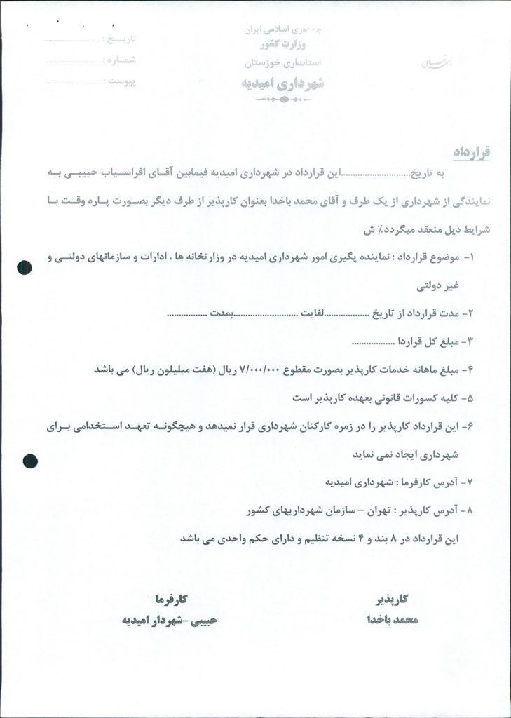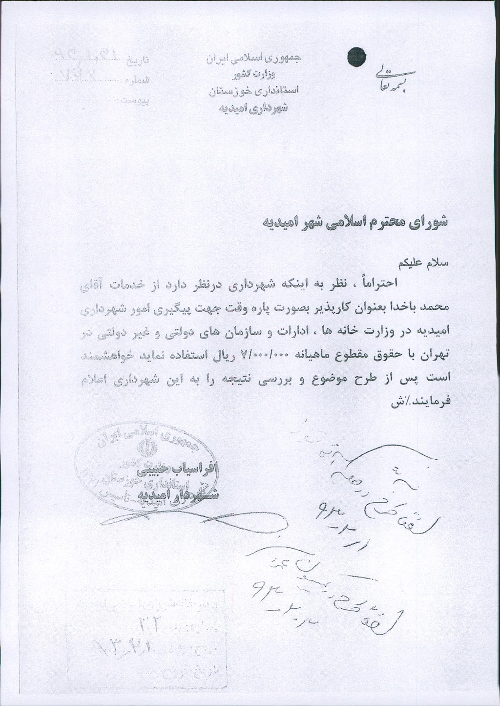 نامه شماره فوق شهرداری در خصوص بکارگیری آقای محمد باخدا بعنوان کارپذیر بصورت پاره وقت جهت پیگیری امور شهرداری در وزارت خانه ها ، ادرات و سازمانهای دولتی و غیردولتی در تهران با حقوق ماهیانه ۷۰۰۰۰۰۰ ریال با قرارداد ۶ماهه و در صورت رضایت شهردار از عملکرد قابل تمدید تا یکسال در جلسه مطرح وپس از بحث و بررسی با مجموع آراء ذیل مصوب گردید%