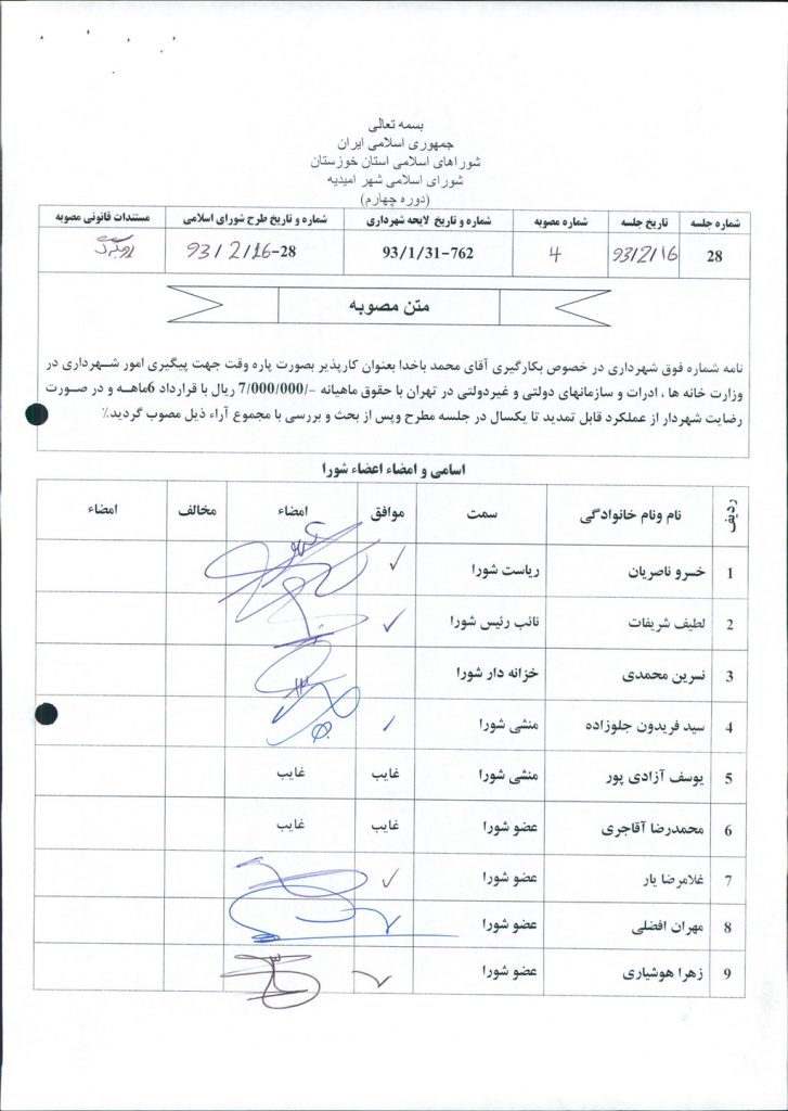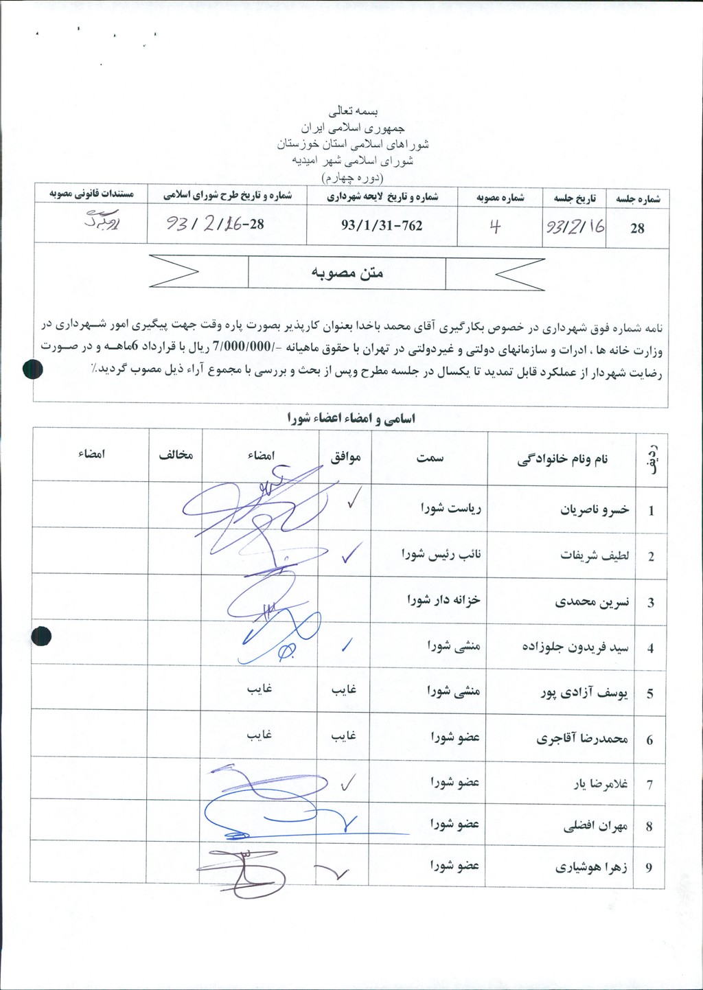 مصوبه شماره ۴ جلسه شماره ۲۸ شورای اسلامی شهر امیدیه