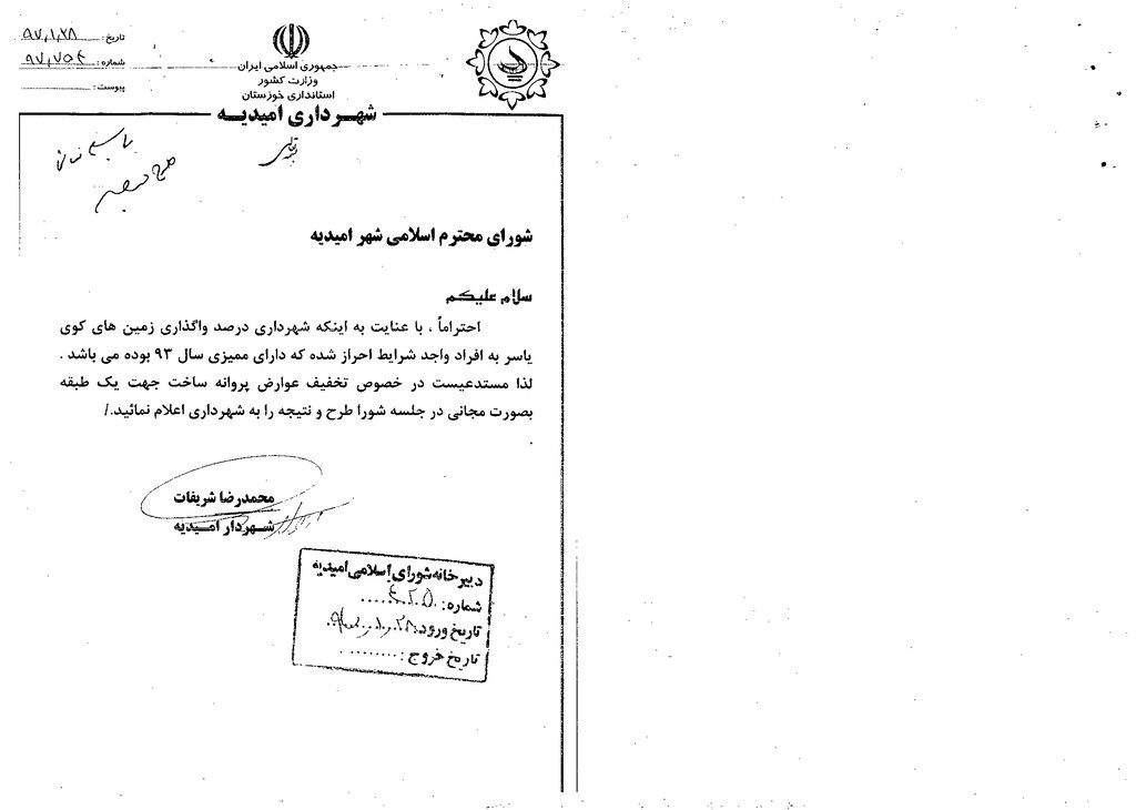 نامه شماره فوق شهرداری در خصوص تخفیف عوارض پروانه ساخت یک طبقه به صورت مجانی به افراد واجد شرایط احراز واگذاری زمین های کوی یاسر که دارای ممیزی سال ۹۳ باشند و بخواهند برای خود ساخت و ساز نمایند با گذاشتن سفته به مبلغ پروانه ساخت تا زمان دریافت پایانکار نزد شهرداری ، در جلسه مطرح و پس از بحث و بررسی با مجموع آراء ذیل مصوب گردید%