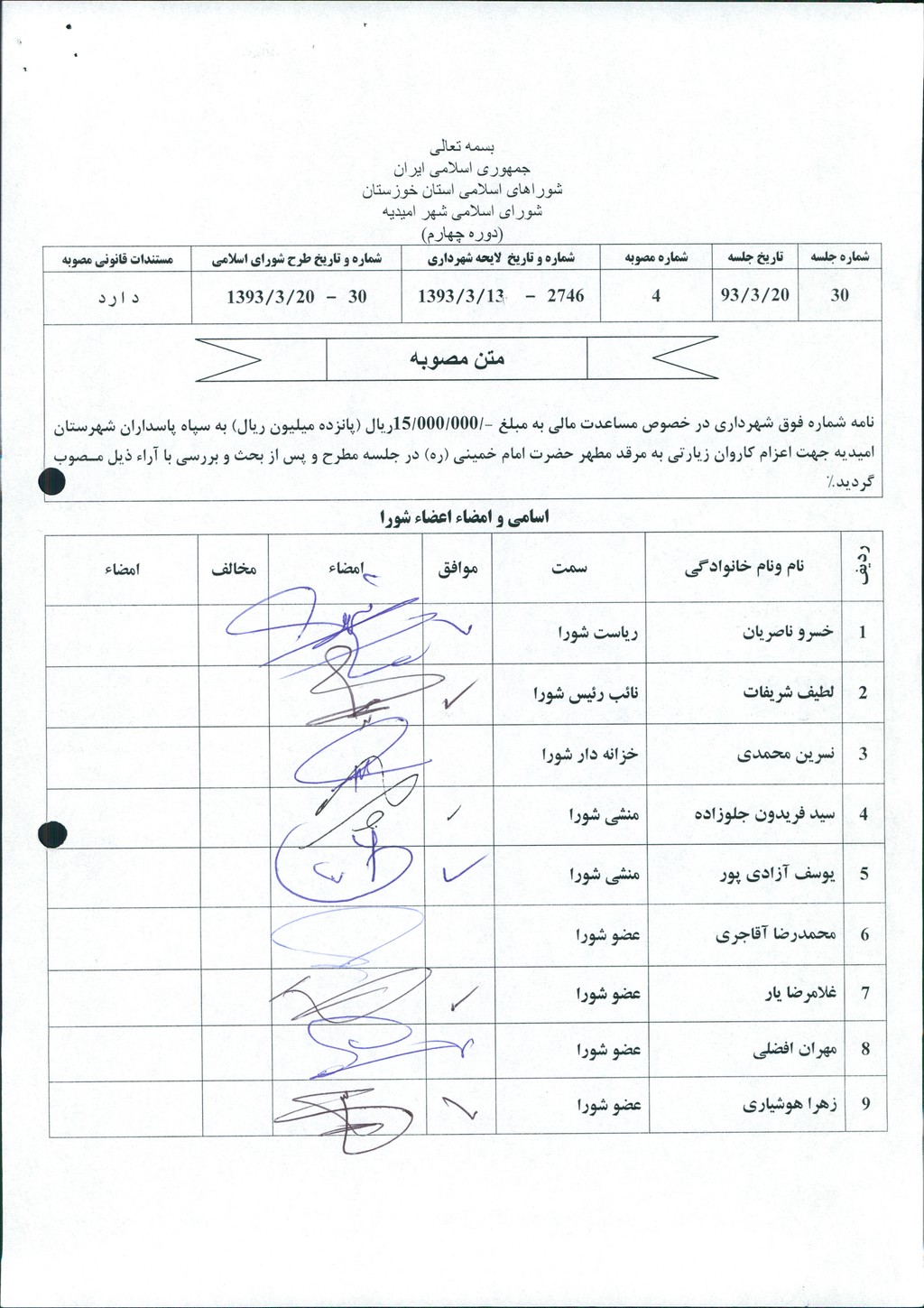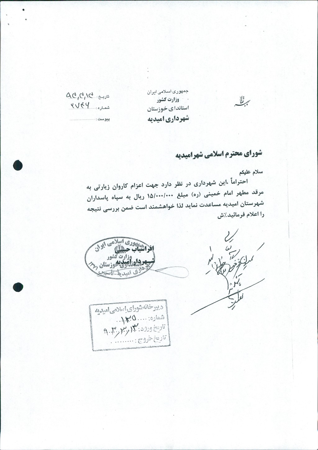 نامه شماره فوق شهرداری در خصوص مساعدت مالی به مبلغ ۱۵۰۰۰۰۰۰ريال (پانزده میلیون ريال) به سپاه پاسداران شهرستان امیدیه جهت اعزام کاروان زیارتی به مرقد مطهر حضرت امام خمینی (ره) در جلسه مطرح و پس از بحث و بررسی با آراء ذیل مصوب گردید%