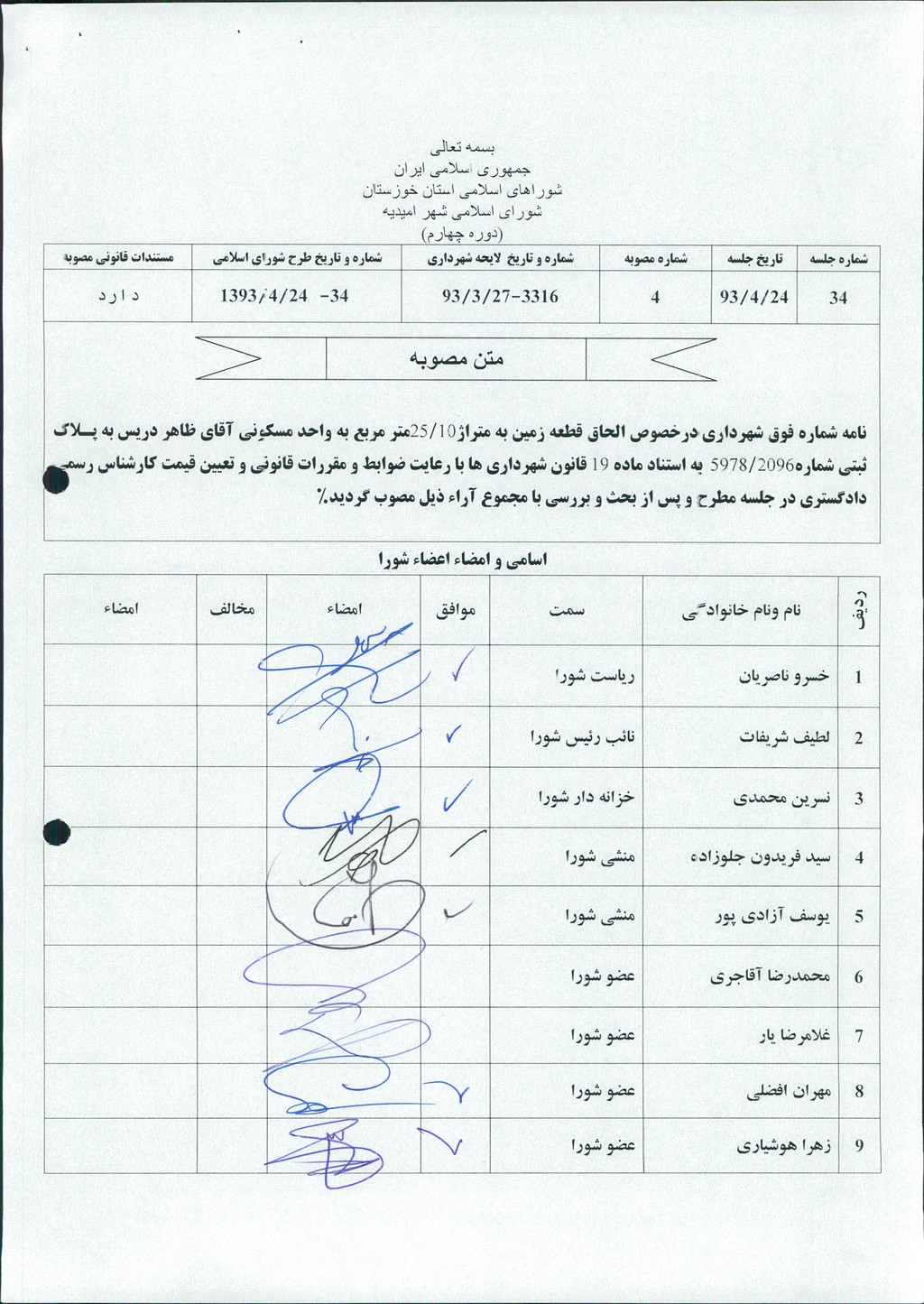 مصوبه شماره ۴ جلسه شماره ۳۴ مورخ ۹۳/۴/۲۴ شورای اسلامی شهر امیدیه
