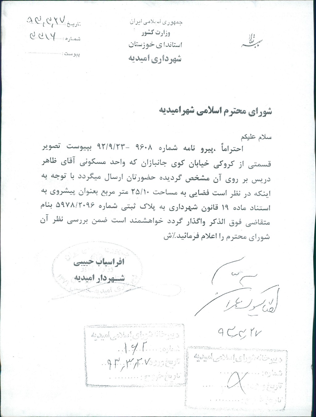 نامه شماره فوق شهرداری درخصوص الحاق قطعه زمین به متراژ۱۰/۲۵متر مربع به واحد مسکونی آقای ظاهر دریس به پلاک ثبتی شماره۲۰۹۶/۵۹۷۸  به استناد ماده ۱۹ قانون شهرداری ها با رعایت ضوابط و مقررات قانونی و تعیین قیمت کارشناس رسمی دادگستری در جلسه مطرح و پس از بحث و بررسی با مجموع آراء ذیل مصوب گردید%