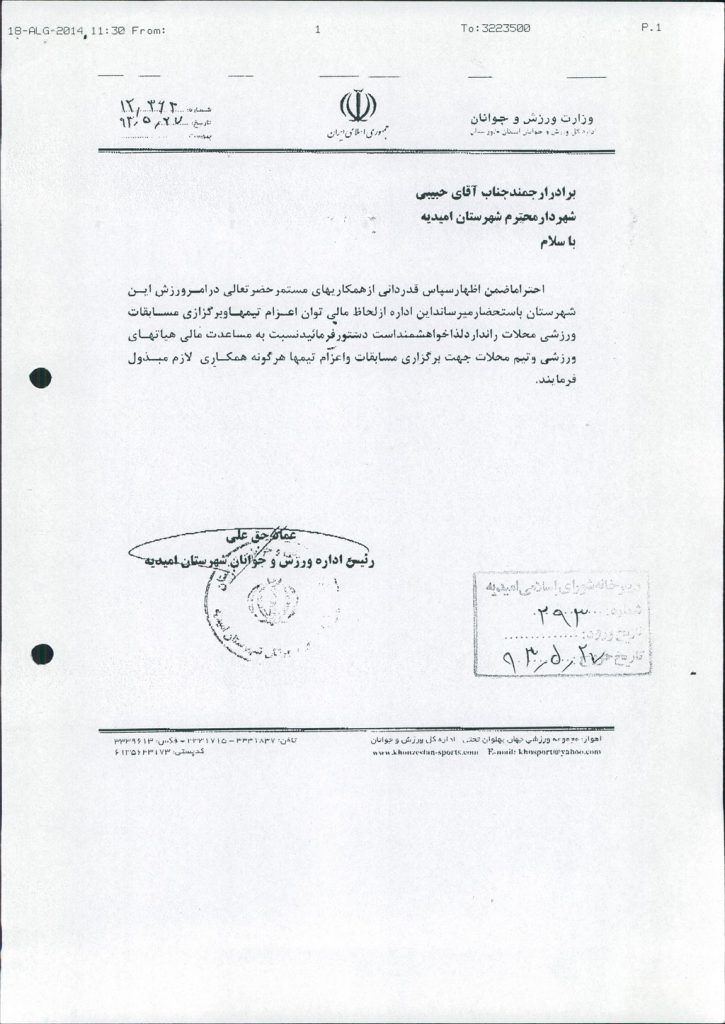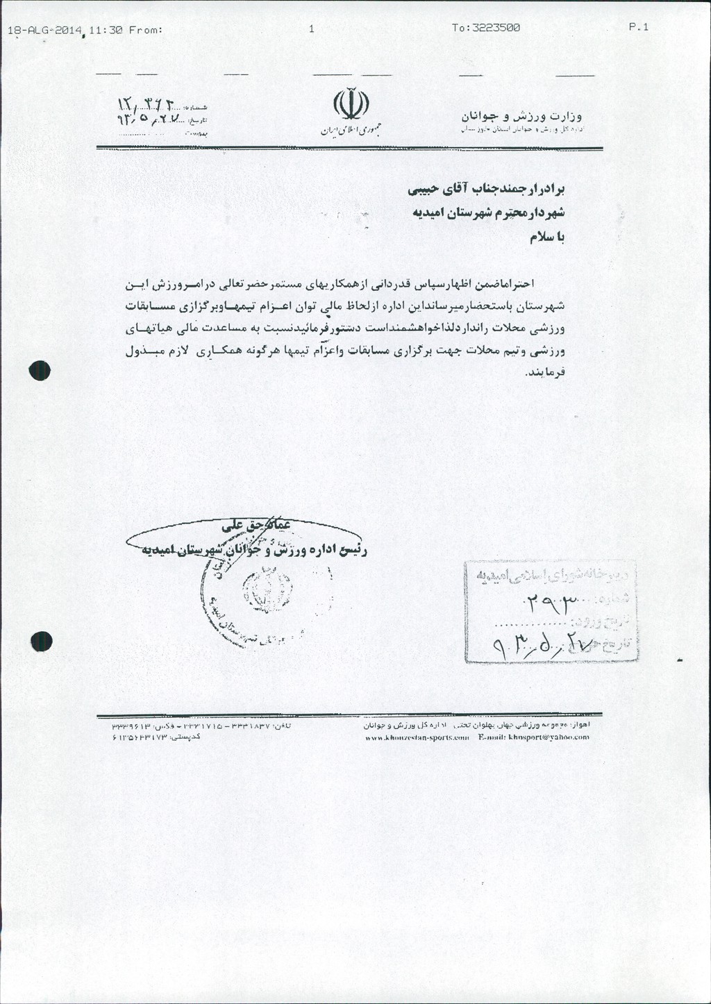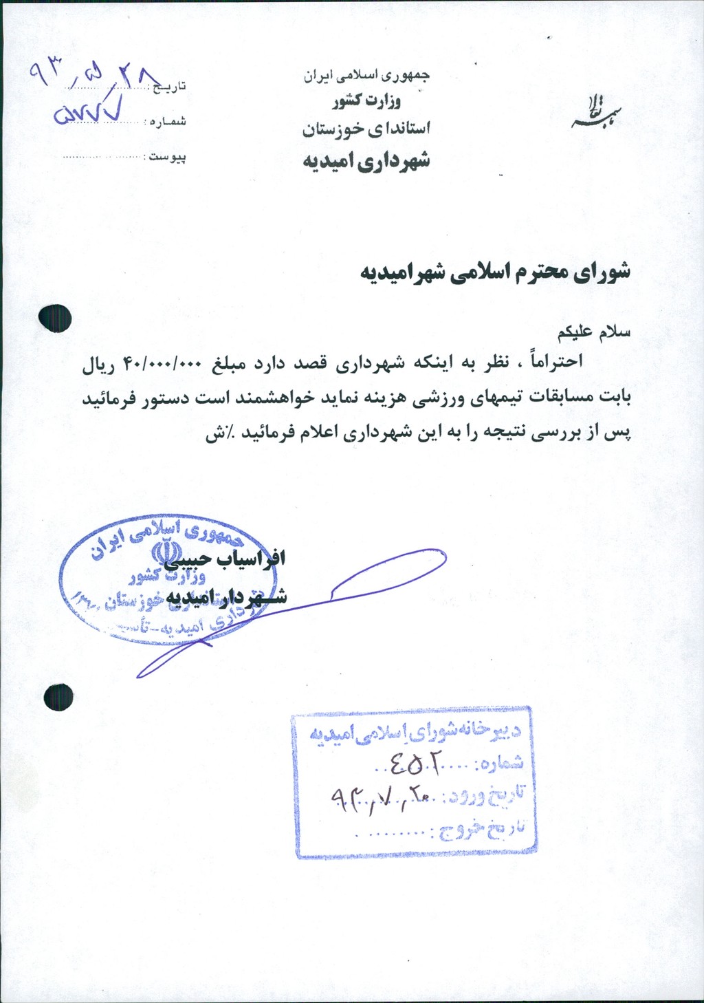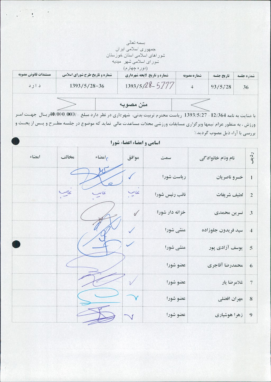 باعنایت به نامه ۳۶۴/۱۲-۲۷/۴/۱۳۹۳ریاست محترم تربیت بدنی ، شهرداری در نظر دارد مبلغ ۴۰۰۰۰۰۰۰ ریال جهت امر ورزش ، به منظور اعزام تیمها و برگزاری مسابقات ورزشی محلات مساعدت مالی نماید که موضوع در جلسه مطرح و پس از بحث و بررسی با آراء ذیل مصوب گردید%