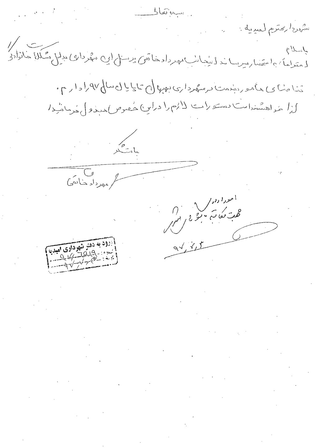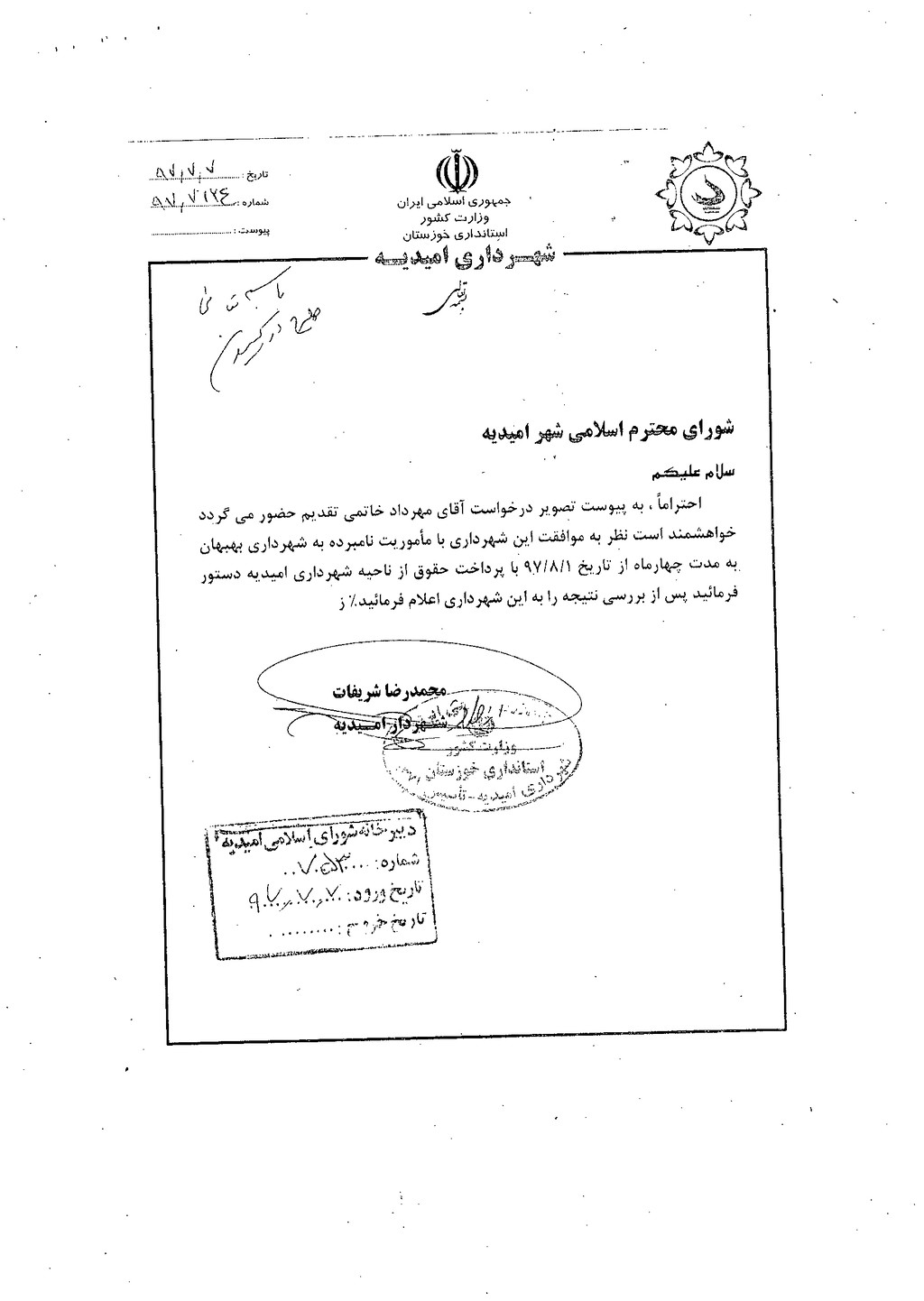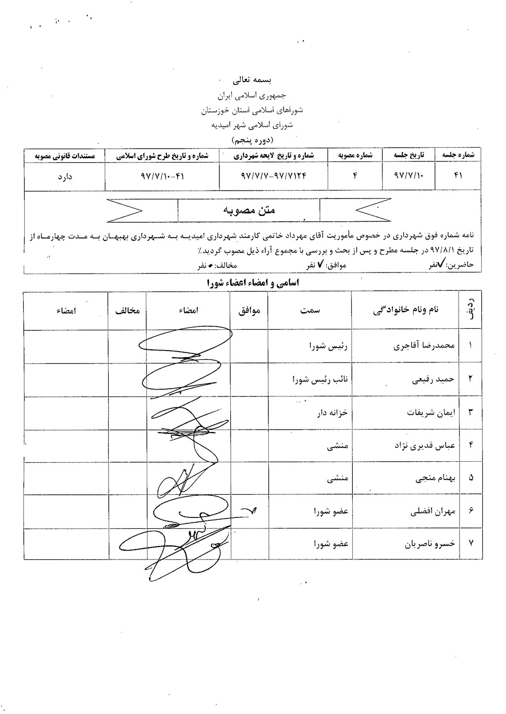 نامه شماره فوق شهرداری در خصوص مأموریت آقای مهرداد خاتمی کارمند شهرداری امیدیه به شهرداری بهبهان به مدت چهارماه از تاریخ ۱/۸/۹۷ در جلسه مطرح و پس از بحث و بررسی با مجموع آراء ذیل مصوب گردید%
