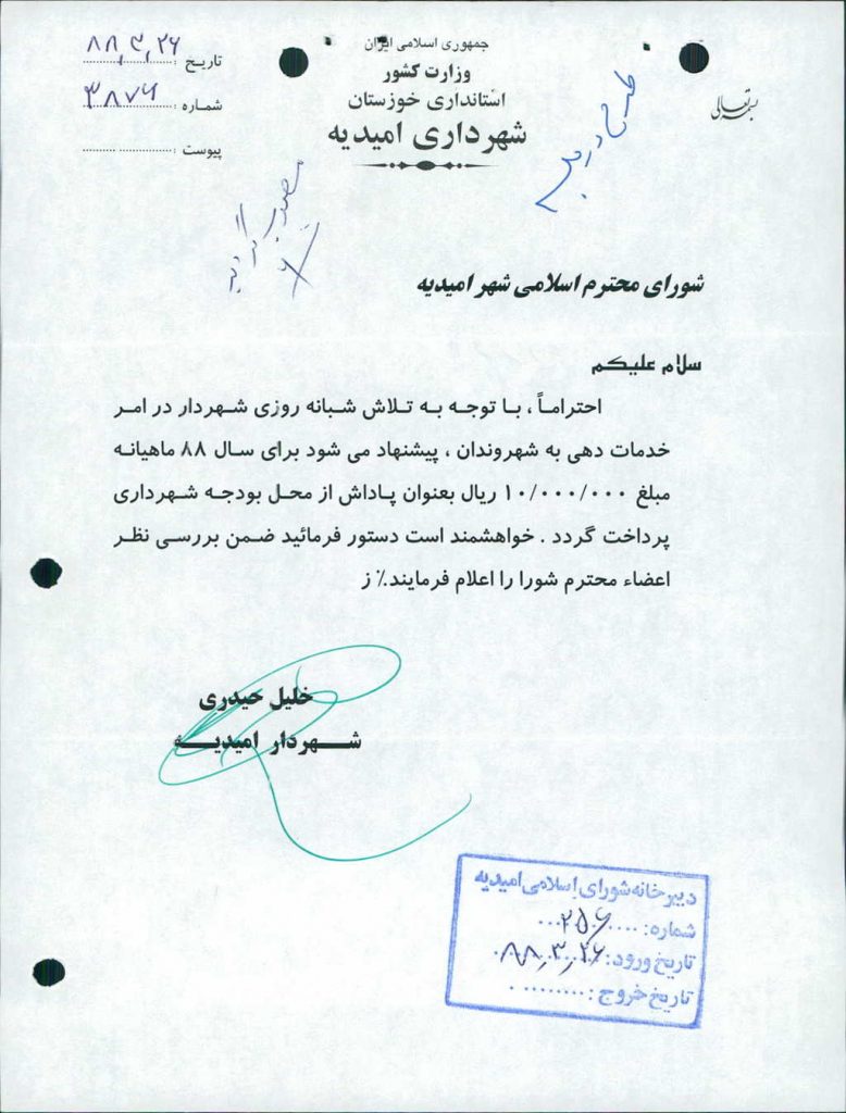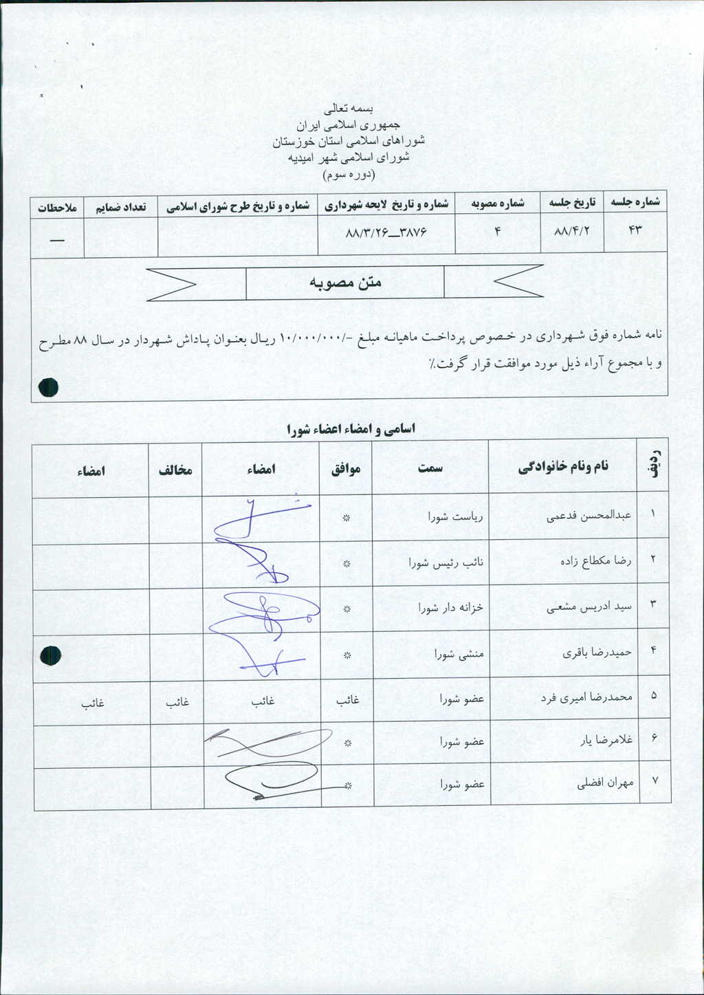 بسم الله الرحمن الرحیم مصوبه شماره ۴ جلسه شماره ۴۳ شورای اسلامی شهر امیدیه