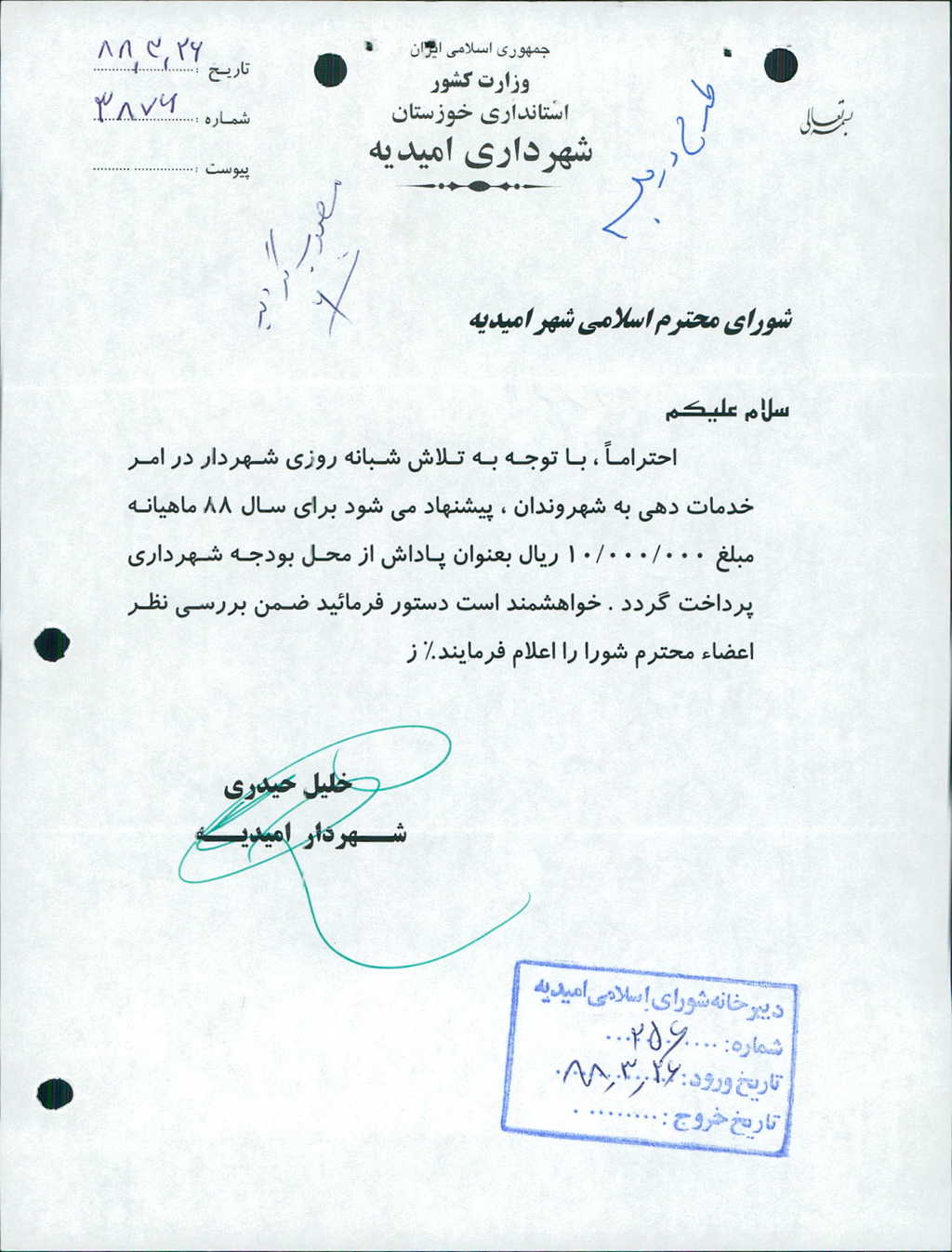 نامه شماره فوق شهرداری در خصوص پرداخت ماهیانه مبلغ ۱۰۰۰۰۰۰۰ ریال بعنوان پاداش شهردار در سال ۸۸ مطرح و با مجموع آراء ذیل مورد موافقت قرار گرفت%