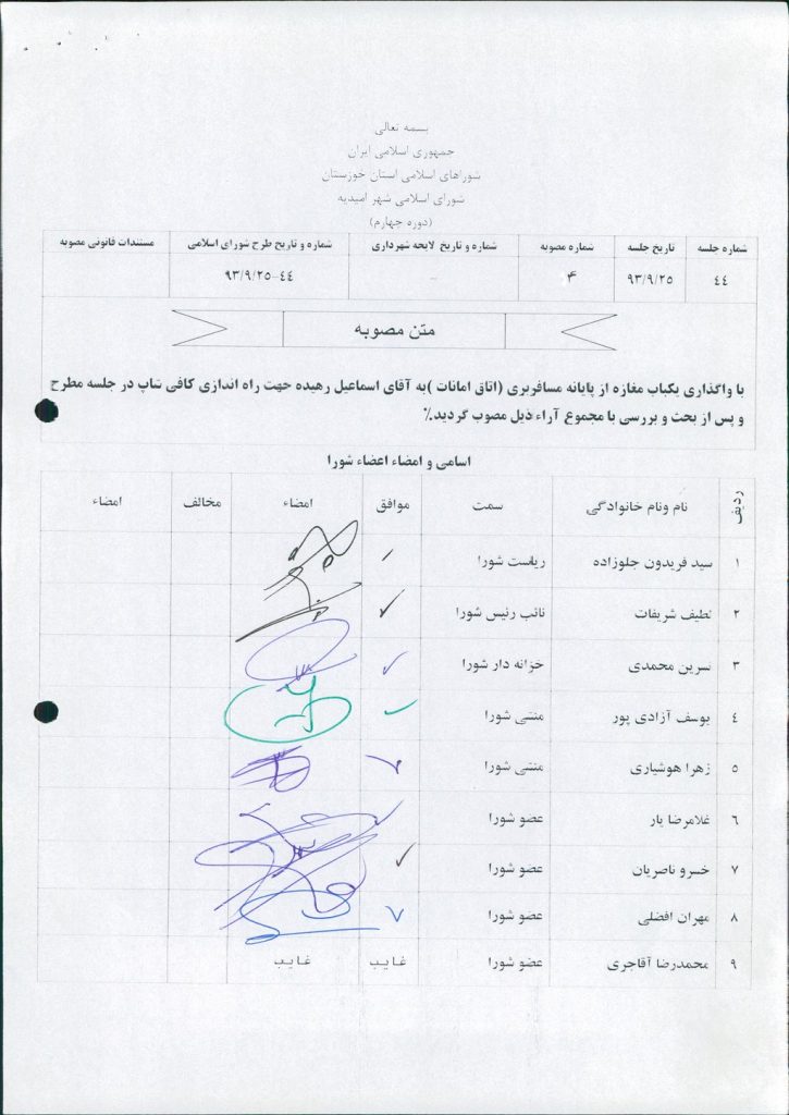 مصوبه شماره ۴ جلسه شماره ۴۴ شورای اسلامی شهر امیدیه