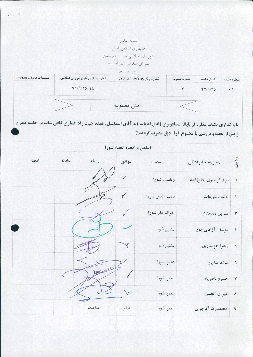 مصوبه شماره ۴ جلسه شماره ۴۴ مورخ ۹۳/۹/۲۵ شورای اسلامی شهر امیدیه