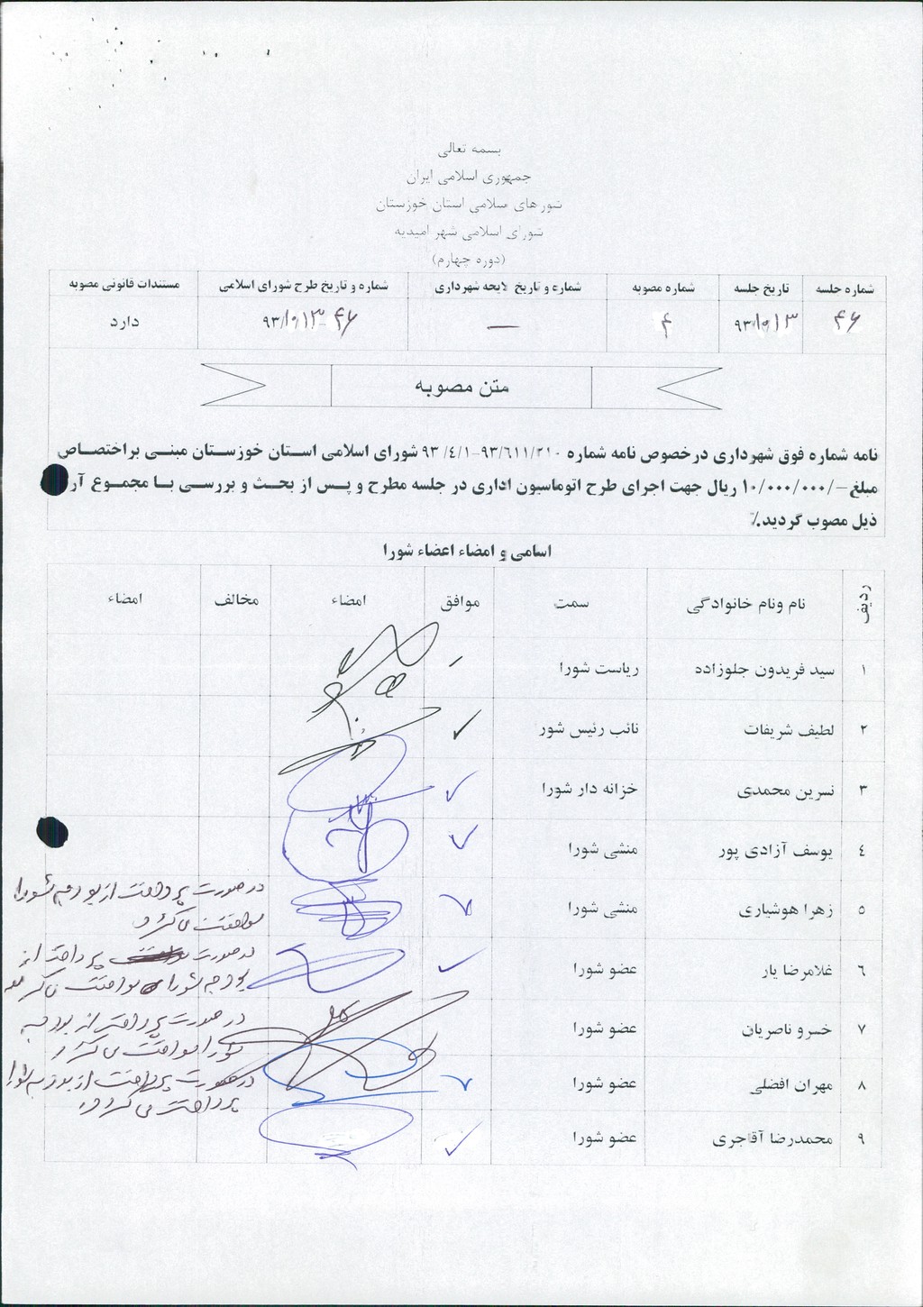 مصوبه شماره ۴ جلسه شماره ۴۶ شورای اسلامی شهر امیدیه