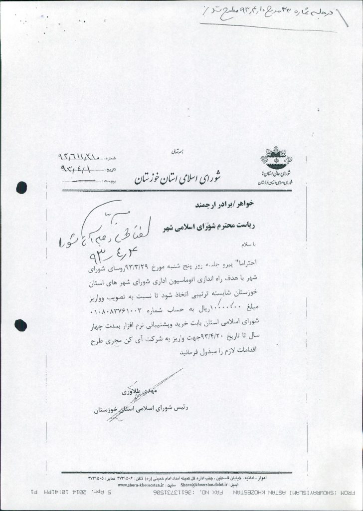 نامه شماره شهرداری در خصوص نامه شماره ۲۱۰/۶۱۱/۹۳-۱/۴/۹۳ شورای اسلامی استان خوزستان مبنی بر اختصاص مبلغ ۱۰۰۰۰۰۰۰ريال جهت اجرای طرح اتوماسیون اداری در جلسه مطرح و پس از بحث و بررسی با مجموع آراء ذیل مصوب گردید.