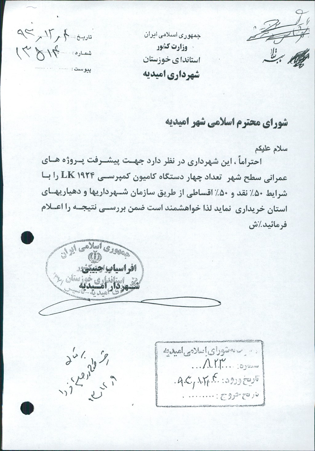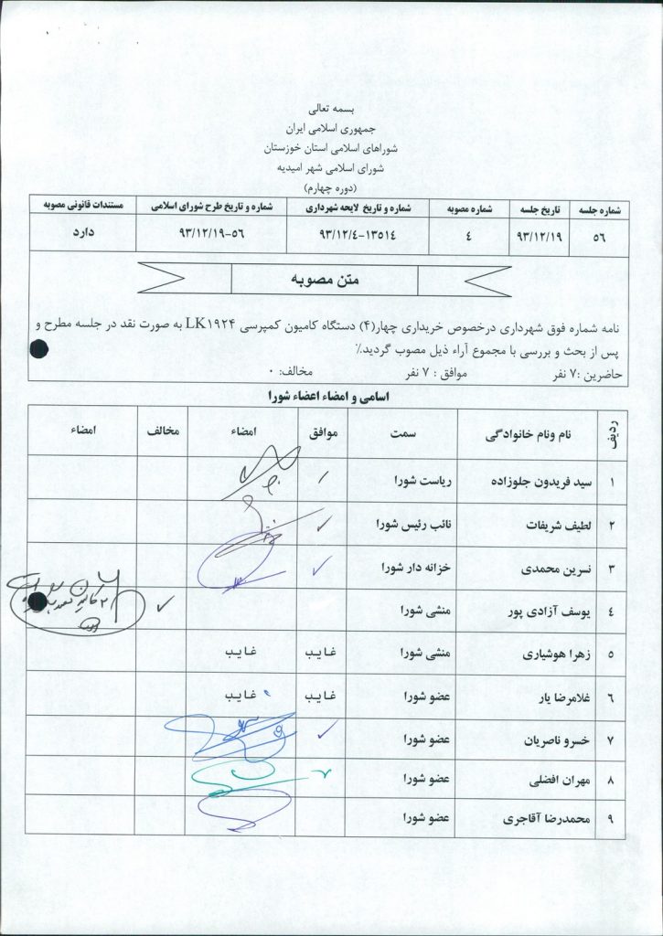 نامه شماره فوق شهرداری درخصوص خریداری چهار(۴) دستگاه کامیون کمپرسی ۱۹۲۴LK به صورت نقد در جلسه مطرح و پس از بحث و بررسی با مجموع آراء ذیل مصوب گردید%